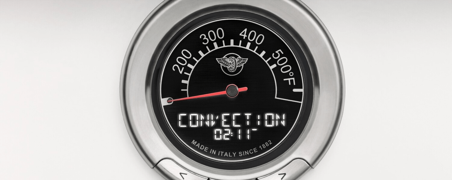 The 5.9 cubic feet oven cavity is the largest in its class, with dual convection fan for balanced airflow and even temperature baking and roasting on 7 shelf levels. The elegant digital gauge gives precise control of oven temperature during pre-heating, roasting and baking, and has integrated controls for the food temperature probe. The extra wide infrared gas broiler is ideal for grilling and searing at high heat. The oven includes convenient features such as smooth telescopic glides for the oven shelves and soft-close doors. The edge-to-edge interior oven glass door maximizes interior volume and can be wiped clean without effort.