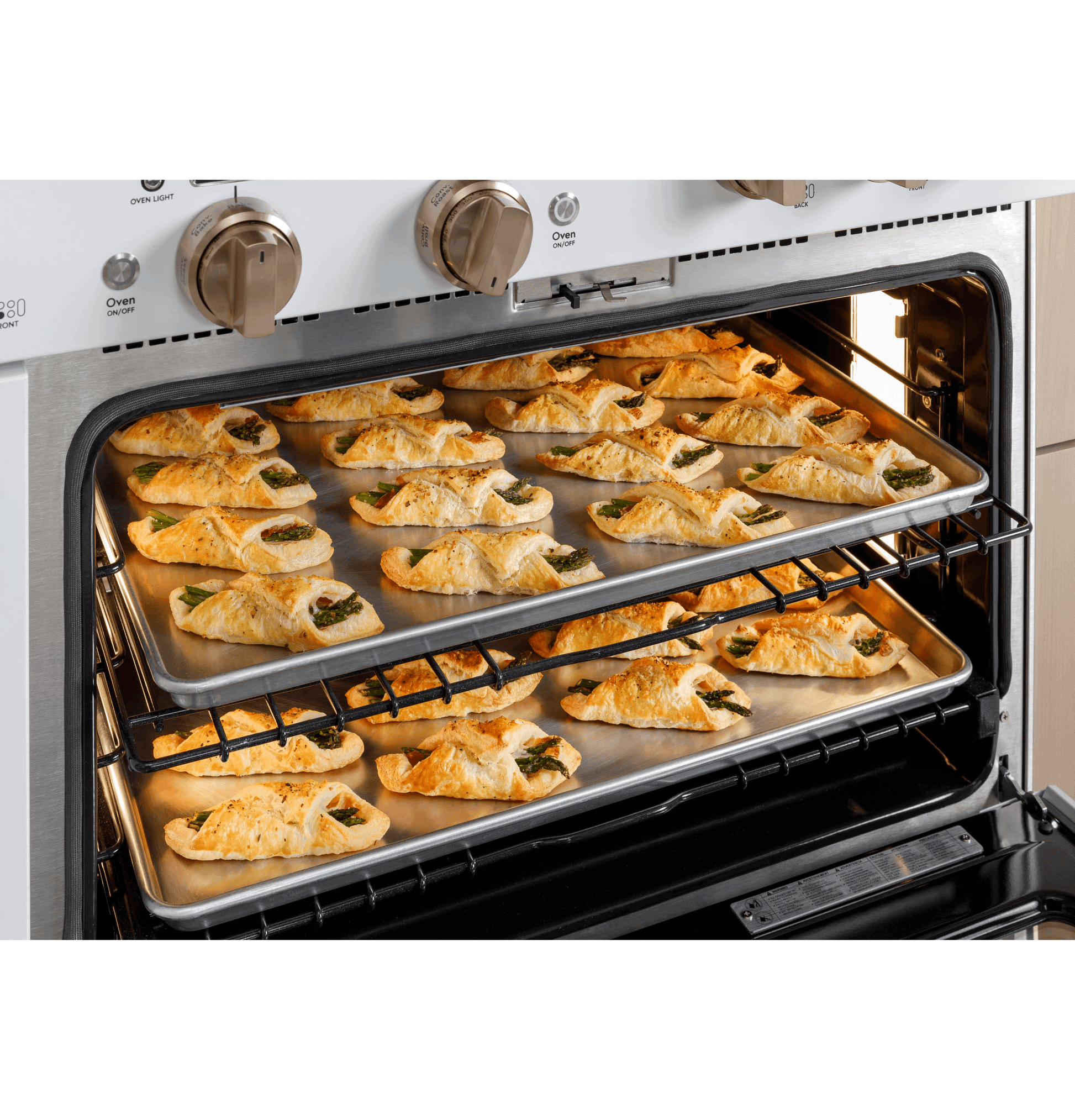 A large capacity oven fits a full-size catering pan and has three racks, large 8-pass bake and broil elements for even heat coverage and Precision Oven modes to help guarantee results for meals of any size