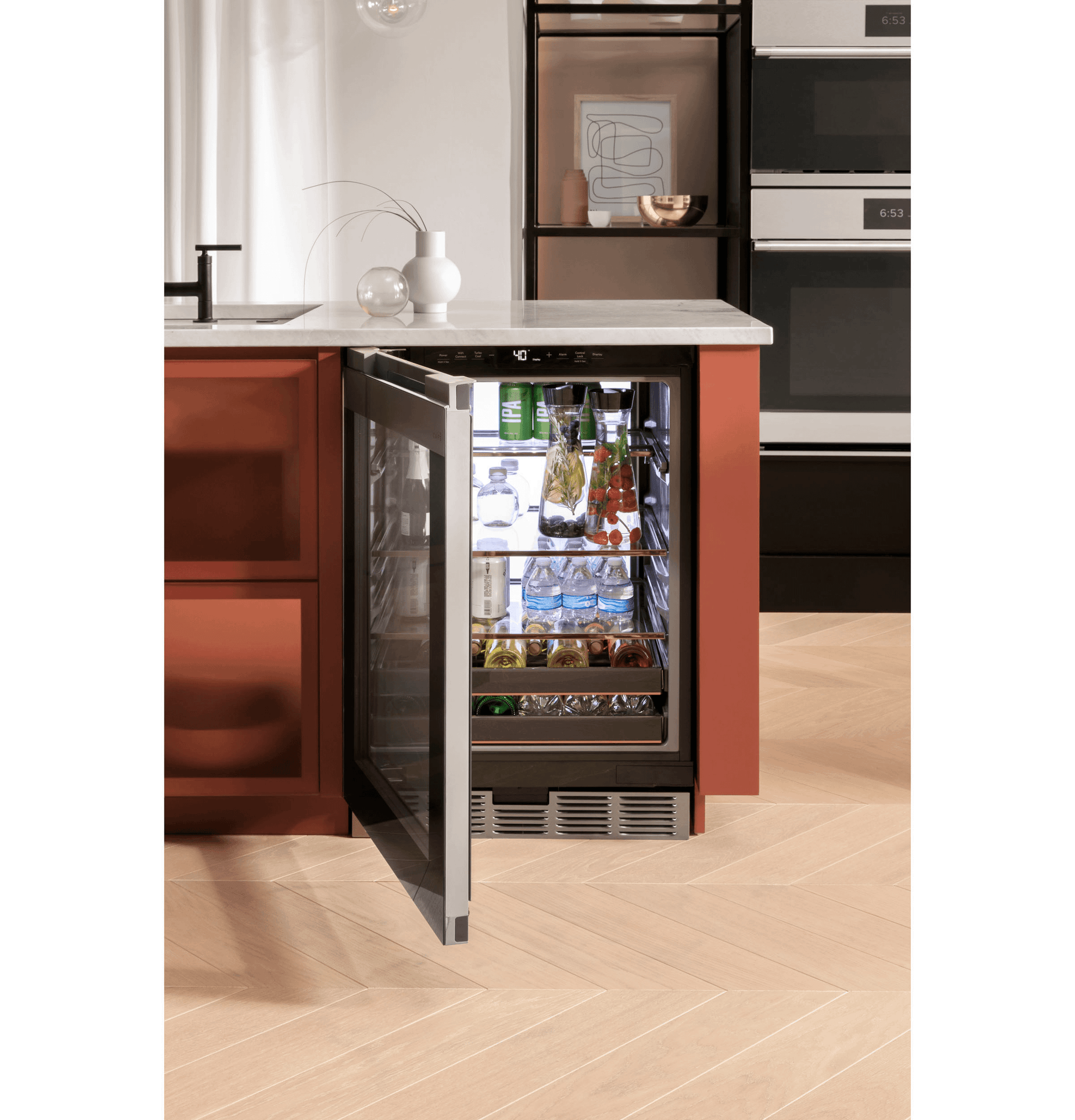 This beverage center has an attractive, easy-to-clean glass finish that will create a contemporary look in your kitchen