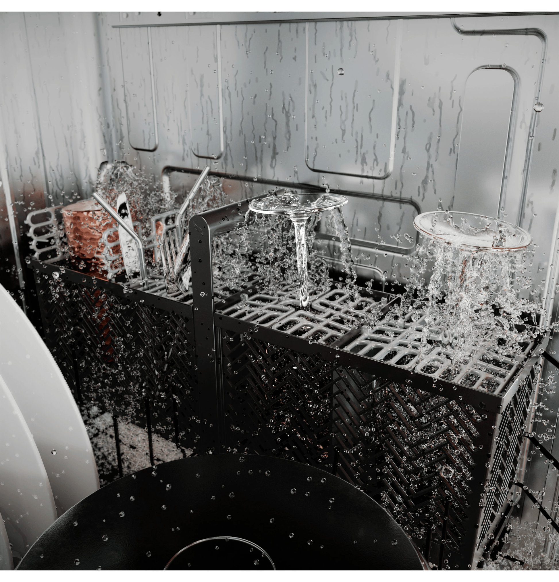 Powerful jets in the top rack and and below the basket in the lower rack work in unison using targeted washing action to clean even the most stuck-on foods from silverware and cooking utensils.