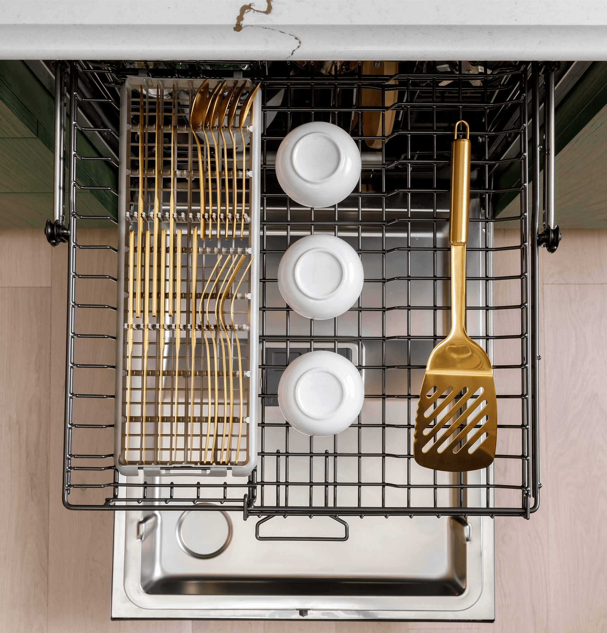 - Load more than just silverware in this redesigned basket. The stylish CustomFit Basket holds all your silverware, delicate stemware, reusable straws and more, so items that were hand wash before can safely be washed in the dishwasher.