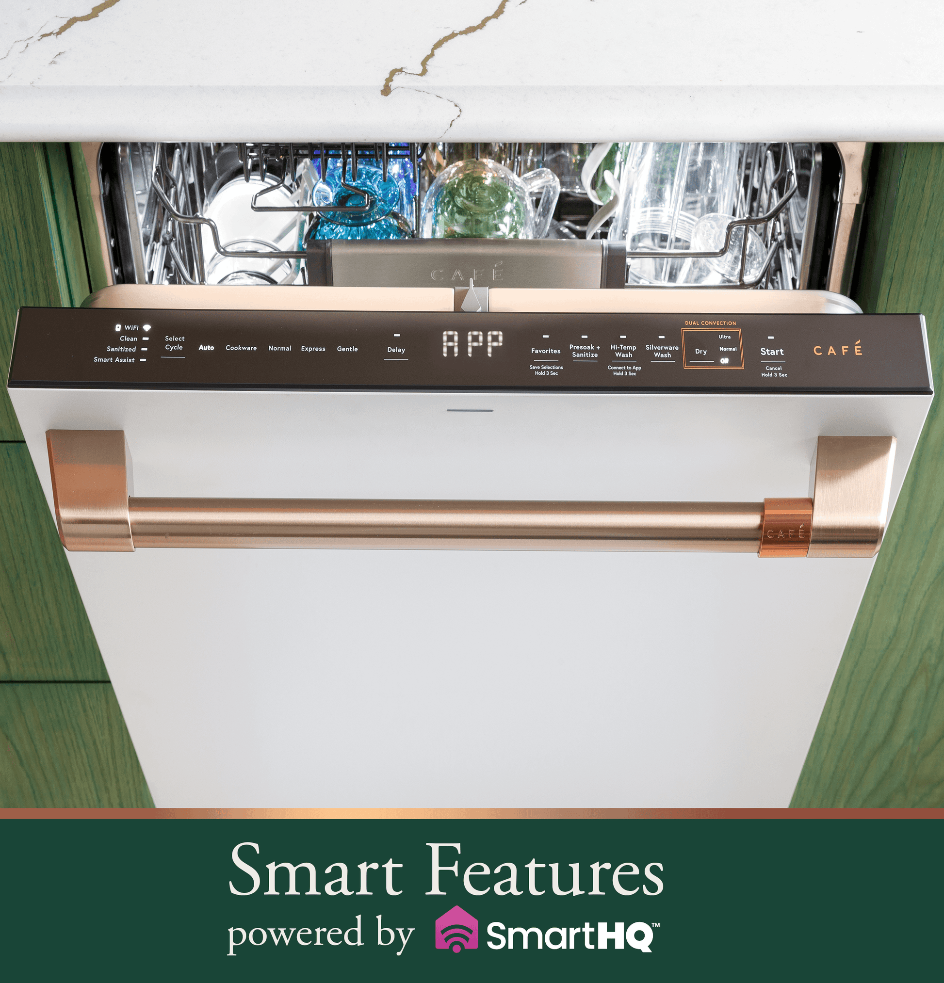 - Built-in WiFi and the SmartHQ(TM) app make it easy to control and monitor your smart dishwasher from anywhere. You can also conveniently access the latest features like Favorites, which allows you to access your favorite cycles with a single button.