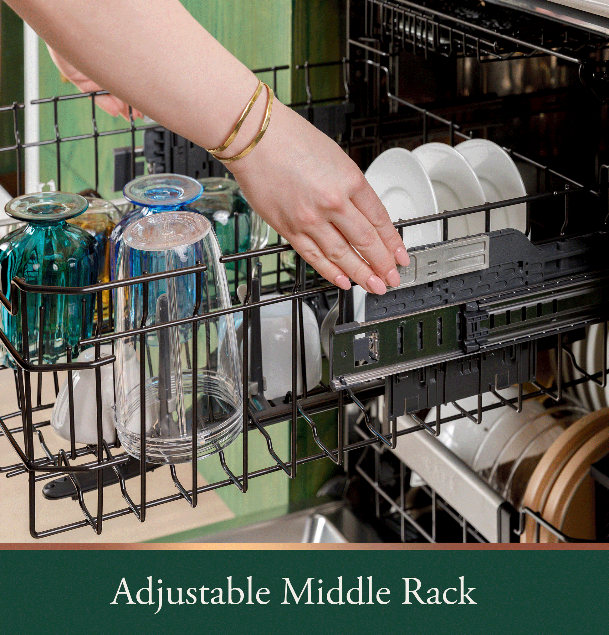 Rack Features | Adjustable Upper Rack Ball-Tipped Tines Cafe Flex Silverware Basket Full Extension Slides - Upper Lid Manager |