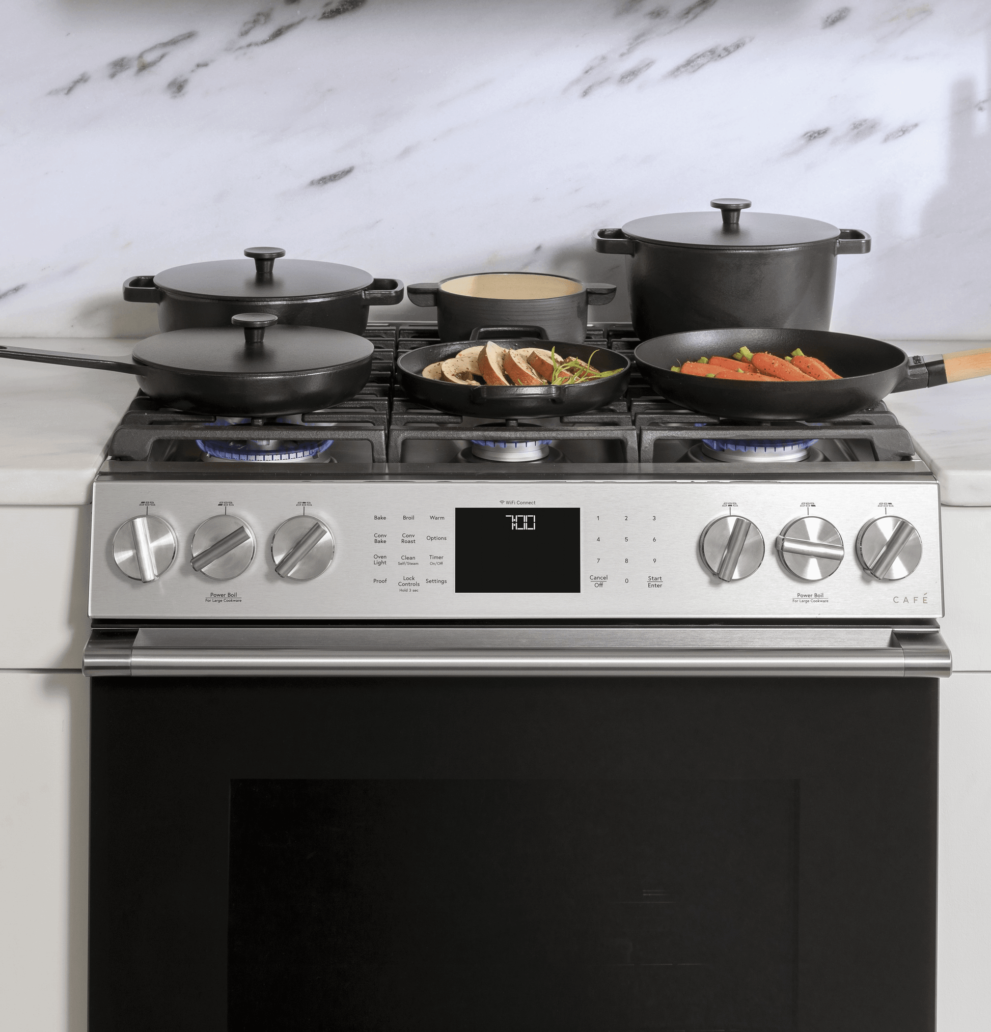 Entertaining for large groups is easy with the industry's first six burner, edge-to-edge cooktop that can accommodate cookware of all sizes and a cast-iron integrated griddle that provides enough room to perfectly flip crab cakes, arepas and other crowd favorites