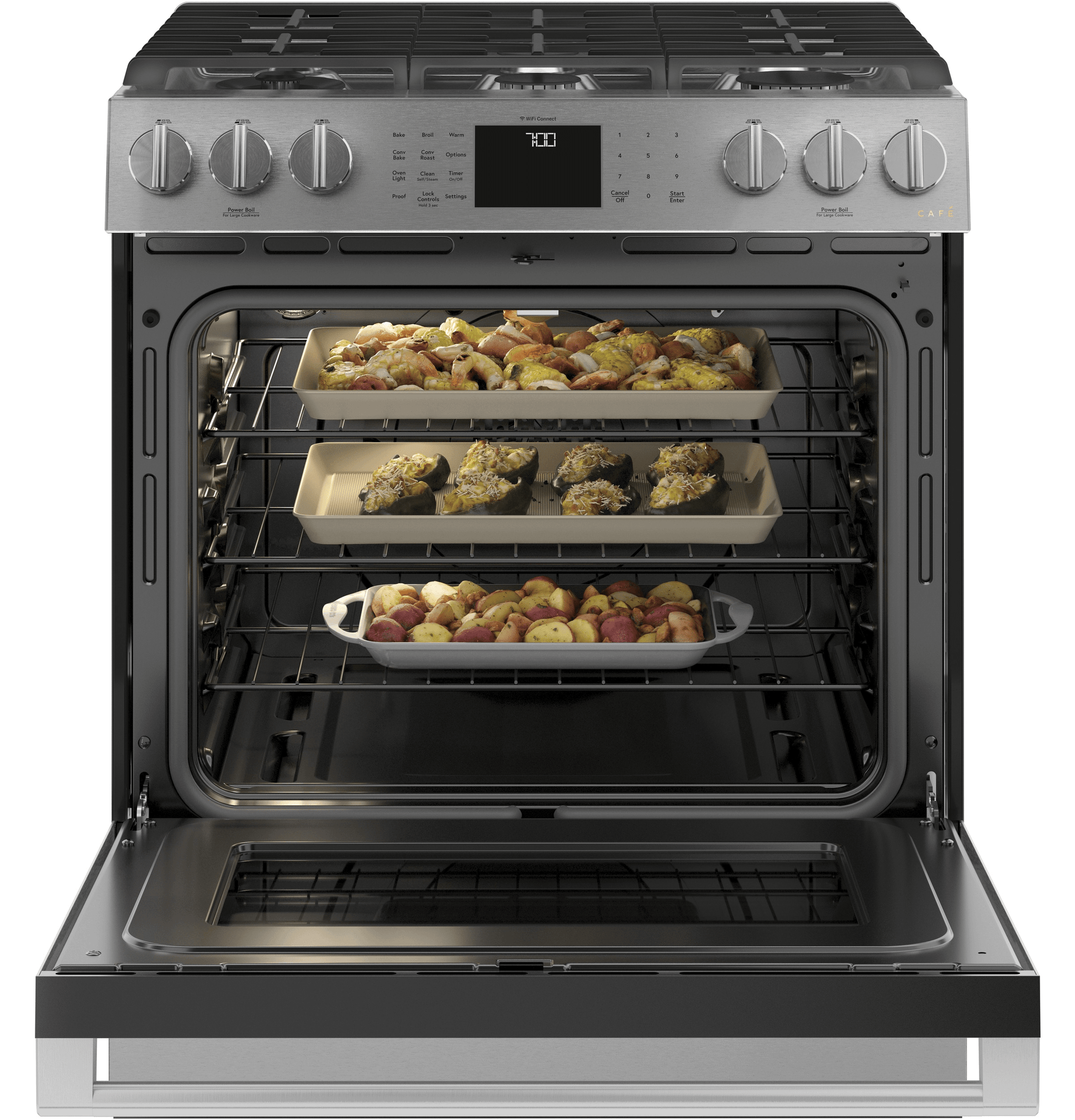 Café™ 30" Smart Slide-In, Front-Control, Gas Range with Convection Oven in Platinum Glass