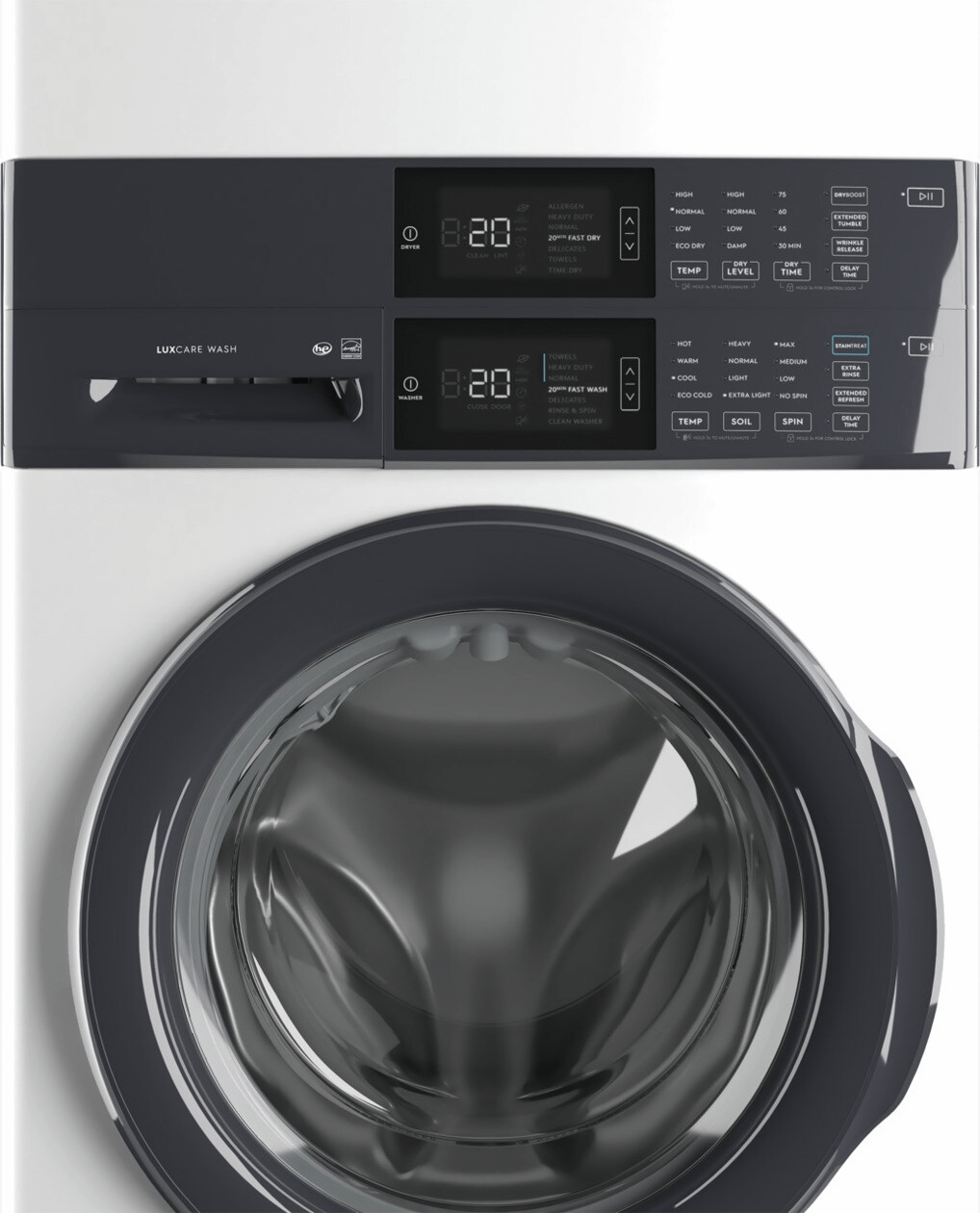 Full-size and fully integrated front load electric Electrolux Laundry Tower™ features a stacked design that takes up half the floor space, freeing up the laundry room for extra storage, all with an easy to reach control panel. The washer features LuxCare® Wash that provides a thorough clean to clothes and fabrics, plus 15 minute fast wash and fast dry