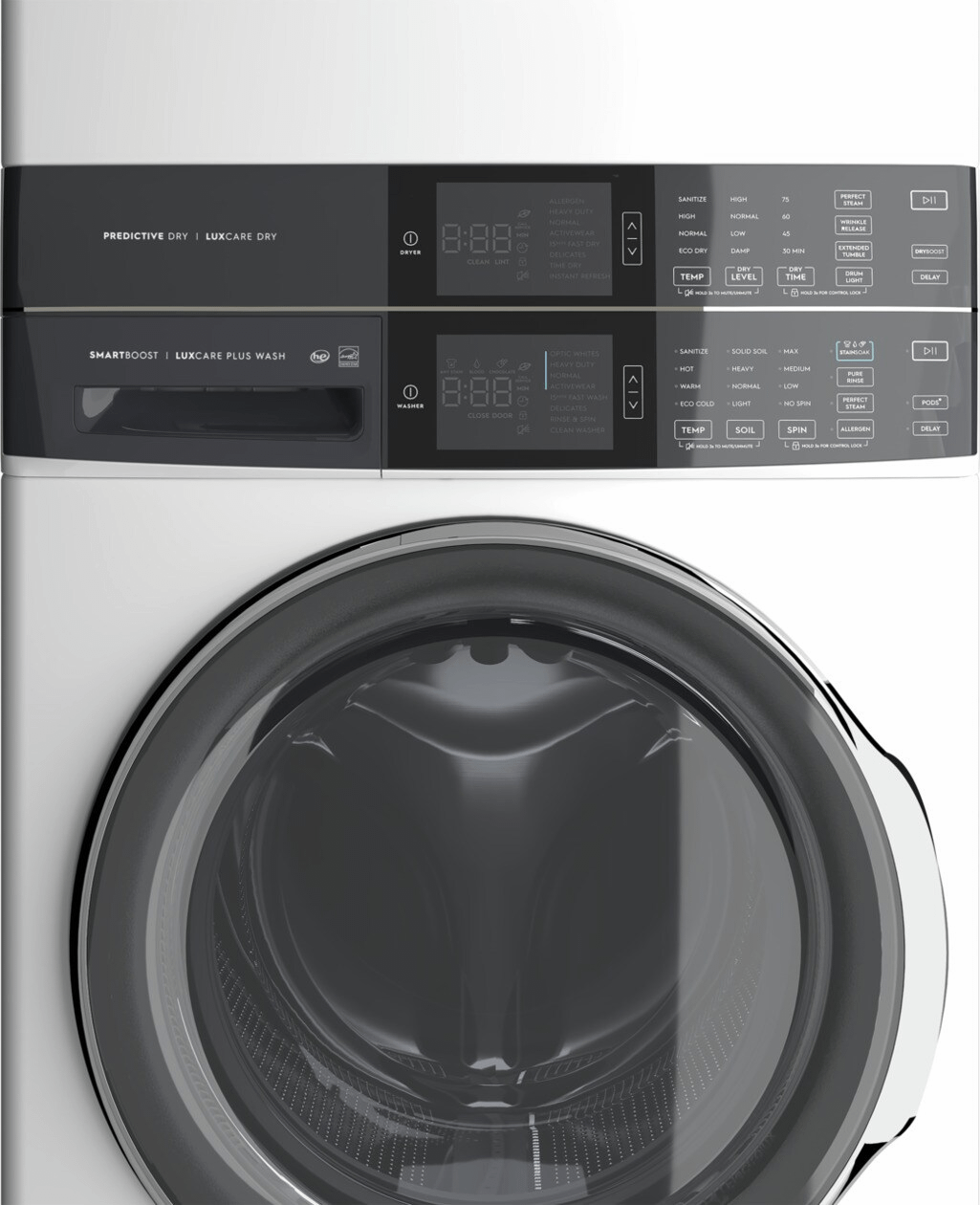 Full-size and fully integrated front load electric Electrolux Laundry Tower™ features a stacked design that takes up half the floor space, freeing up the laundry room for extra storage, all with an easy to reach control panel. The washer provides the most effective stain removal with SmartBoost® premixing technology* and the dryer with LuxCare® Dry uses an moisture sensor to prevent over or under-drying.