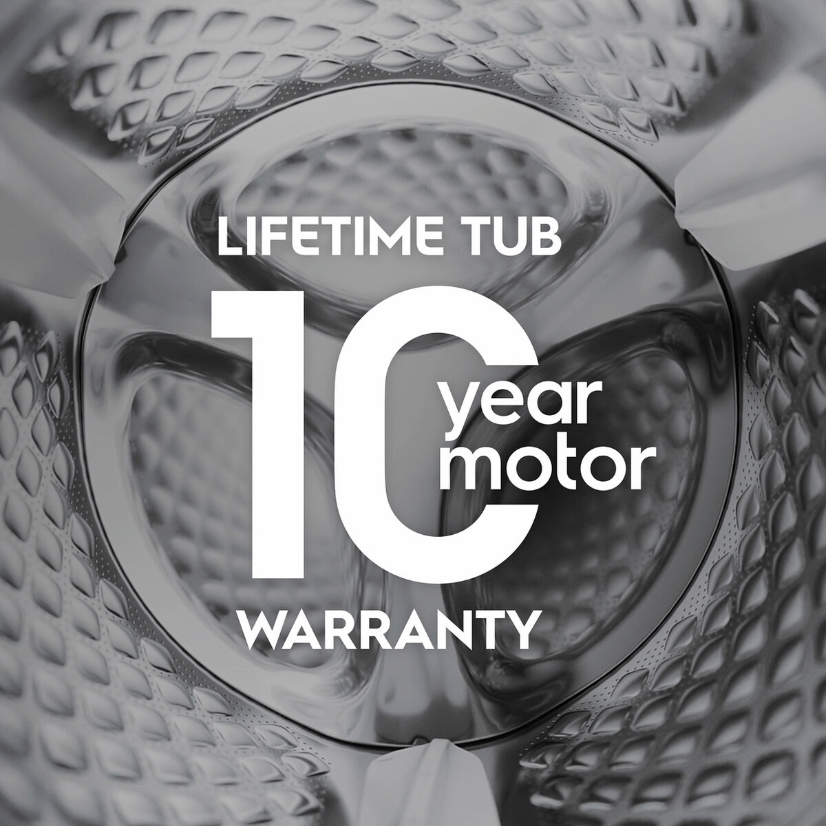 - Rest easy knowing your washer is backed by a 10-year motor and lifetime tub warranty.