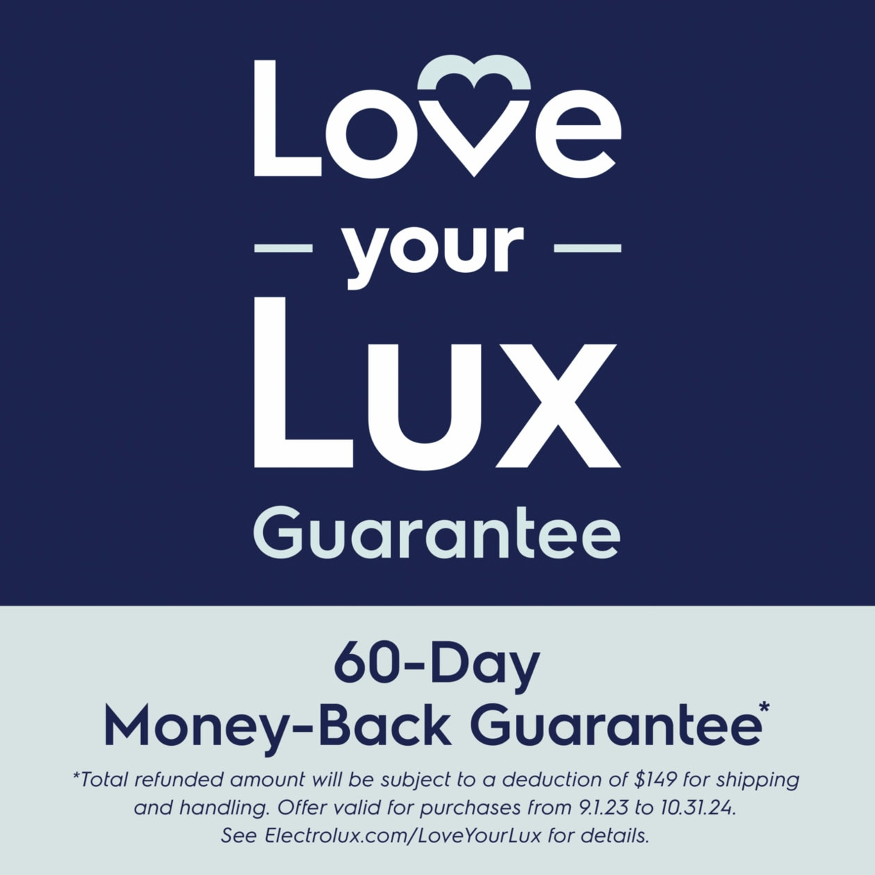 - We are confident you will love your purchase. If for any reason you are not completely satisfied, we offer a 60-day money back guarantee. See Electrolux.com/LoveYourLux for more details. * Total refunded amount will be subject to a deduction of $99 for shipping and handling. See Electrolux.com/LoveYourLux for full guarantee details