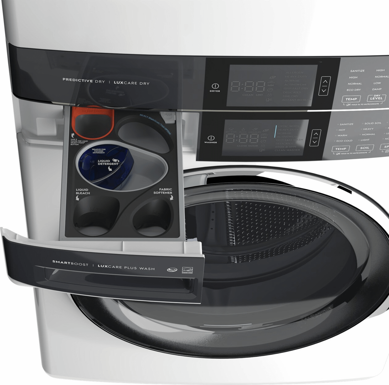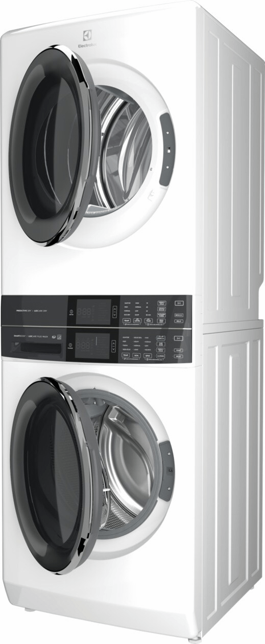 Full-size and fully integrated front load electric/gas Electrolux Laundry Tower™ features a stacked design that takes up half the floor space, freeing up the laundry room for extra storage, all with an easy to reach control panel. The washer provides the most effective stain removal with SmartBoost® premixing technology* and the dryer with LuxCare® Dry uses an moisture sensor to prevent over or under-drying.
