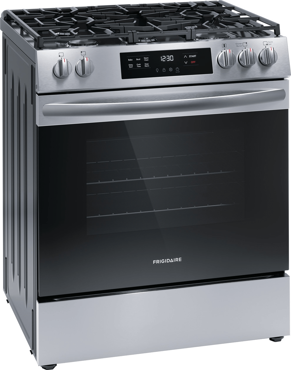 The Frigidaire 30" Front Control Freestanding Gas Range with Quick Boil allows you to experience faster boil times with the 18,000 BTU Quick Boil burner. Plus, our flexible five burner cooktop was designed to fit all your cooking needs. For easier cleanup, our Steam Clean cycle provides a quick 30-minute oven cleaning that's chemical-free, odor-free and fast.