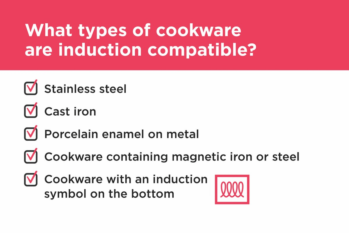- Most stainless steel and cast iron cookware is compatible with induction elements. Rule of thumb: if a magnet sticks to the bottom of the cookware, it's induction-compatible.