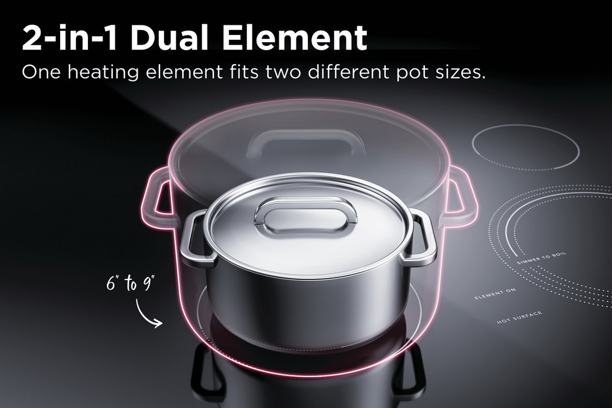 - Our convenient 2-in-1 element expands from 6" for smaller pots to 9" for larger cookware, providing more cooktop flexibility.
