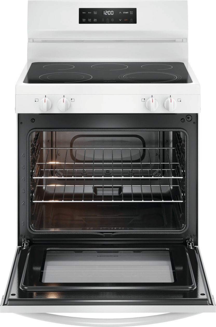 The Frigidaire 30" Electric Range with the EvenTemp® cooktop element delivers consistent results every time, because it reduces hot and cold spots in your pan. Plus, enjoy easier cleanup with our Steam Clean cycle that provides a quick 30-minute oven cleaning that's chemical-free, odor-free and fast.