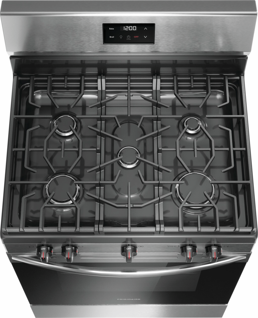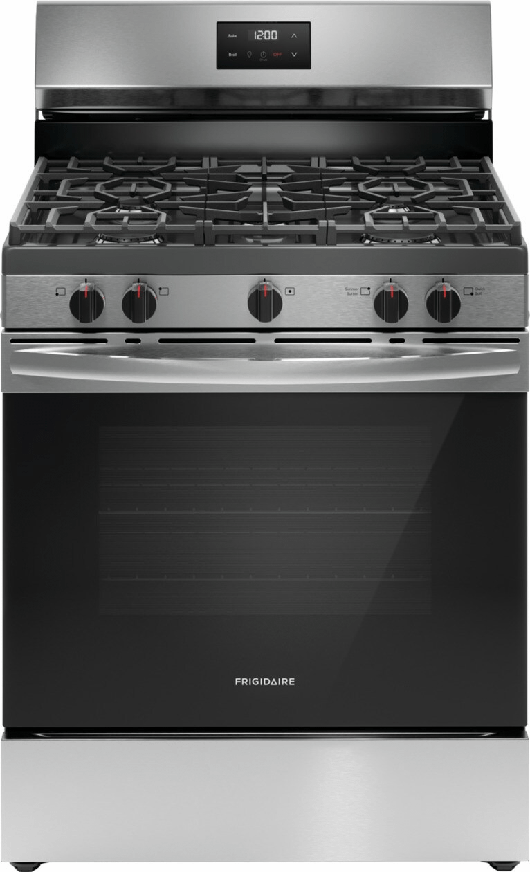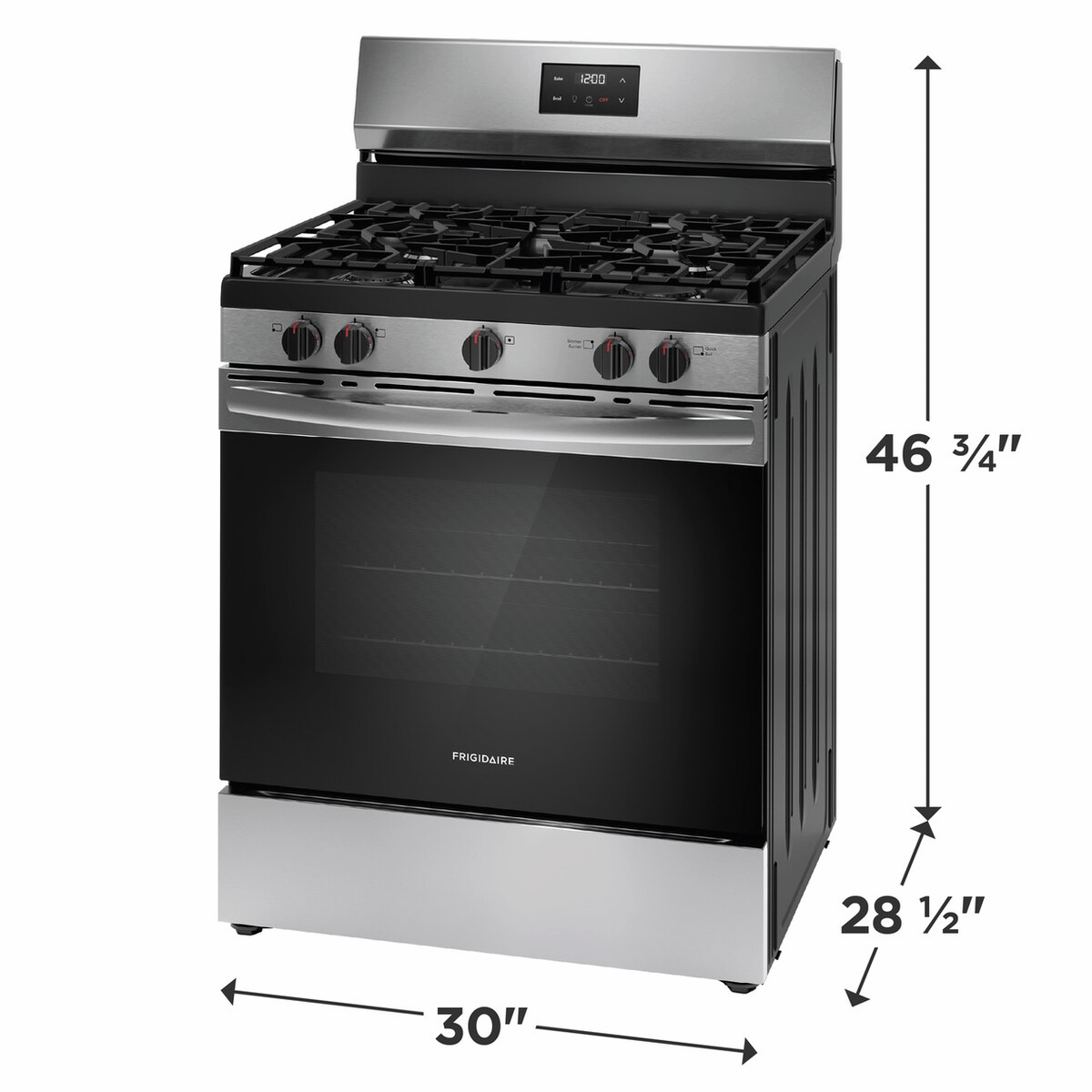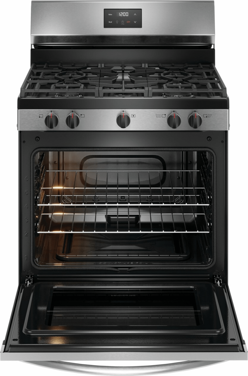 The Frigidaire 30" Gas Range allows you to get to mealtime faster with the powerful 18,000 BTU Quick Boil burner. Experience the ultimate in cooktop flexibility with our five burner cooktop, designed to handle all of your cooking needs. Enjoy consistent, even baking results with our Even Baking Technology. Plus, cook more at once with our large 5.1 cu. ft. capacity oven.