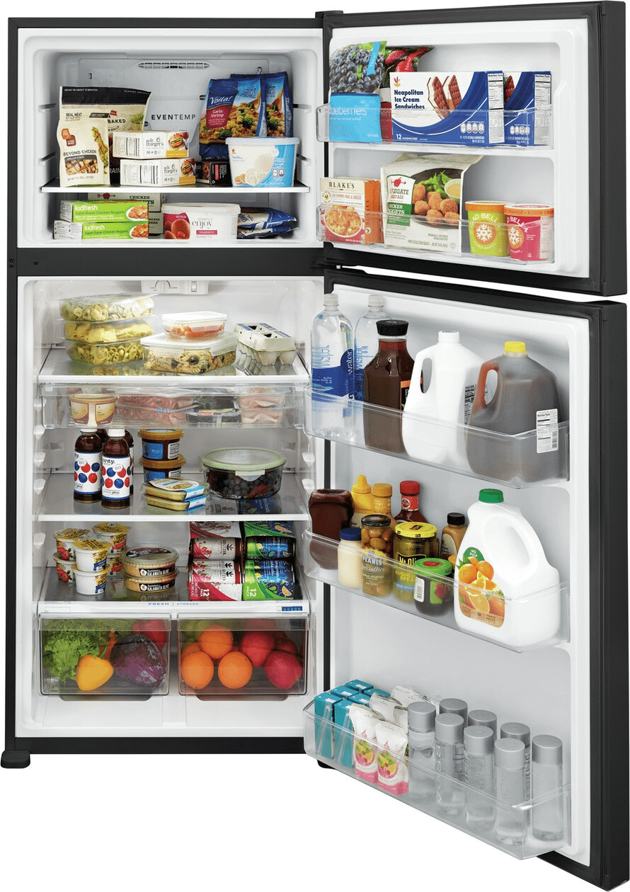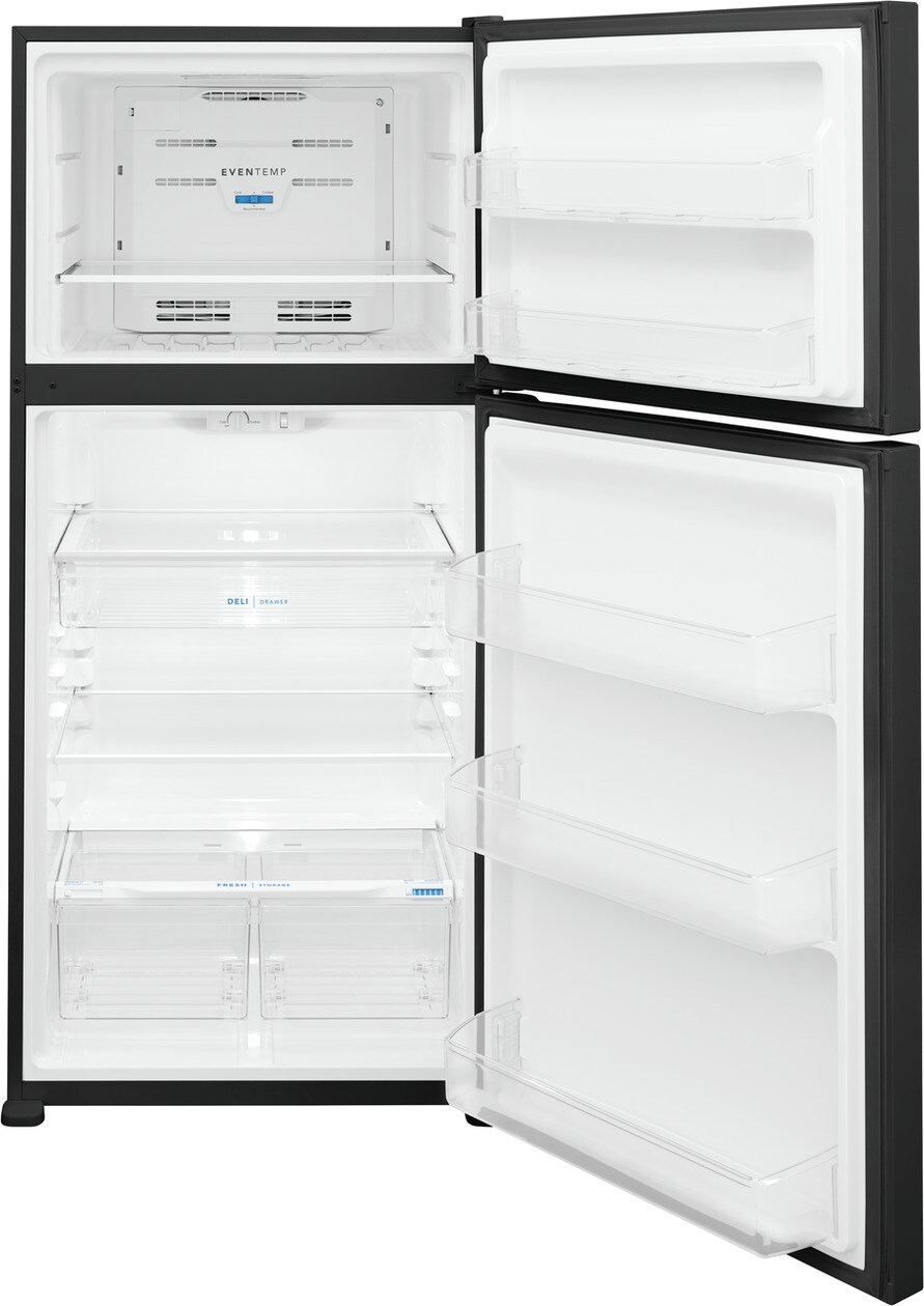 The Frigidaire 20 cubic foot top freezer refrigerator fits in the same sized cutout as a traditional 18 cu. ft. model. This refrigerator features the EvenTemp™ Cooling System, precise temperature control which keeps food at one ideal temperature. Spacious interior storage options include a full-width deli drawer, generous door bins, and a full-width glass freezer shelf.