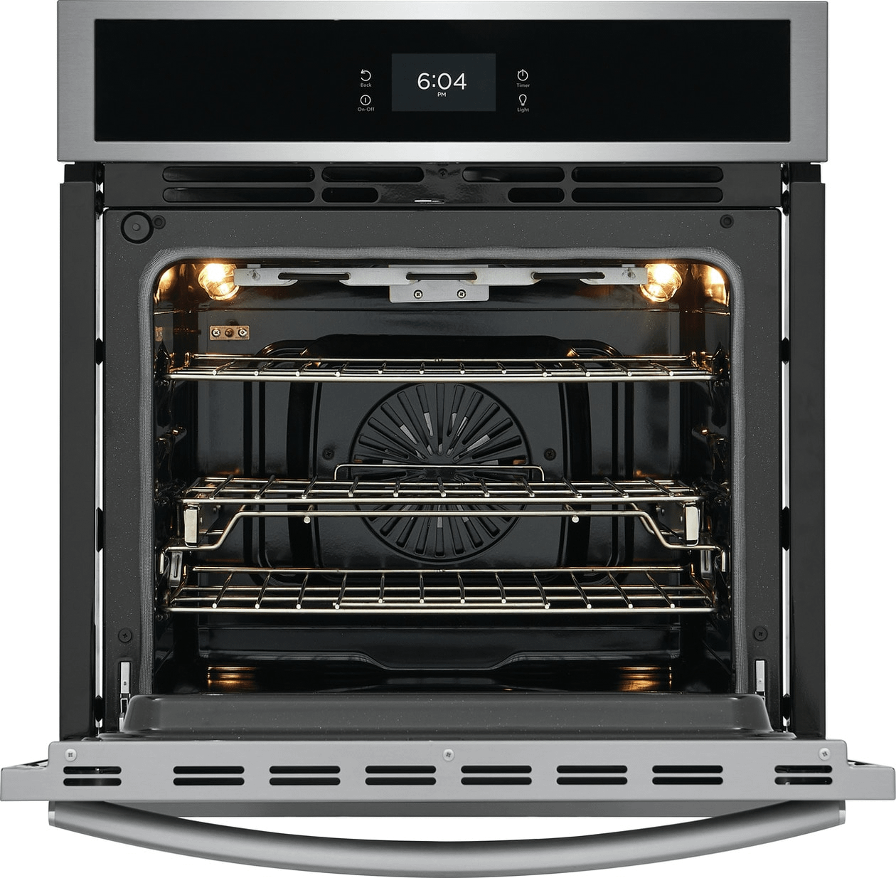 The Frigidaire Gallery 27" Single Wall Oven with Total Convection, features our most powerful and advanced convection system, which enables cooking modes like No Preheat, Air Fry, Slow Cook, Steam Bake, Steam Roast, Air Sous Vide, Convection Roast, Convection Bake, Bread Proof and more! Also includes a convenient temperature probe, a premium touch screen digital control panel and our fingerprint resistant, Smudge-Proof® Stainless Steel finish.