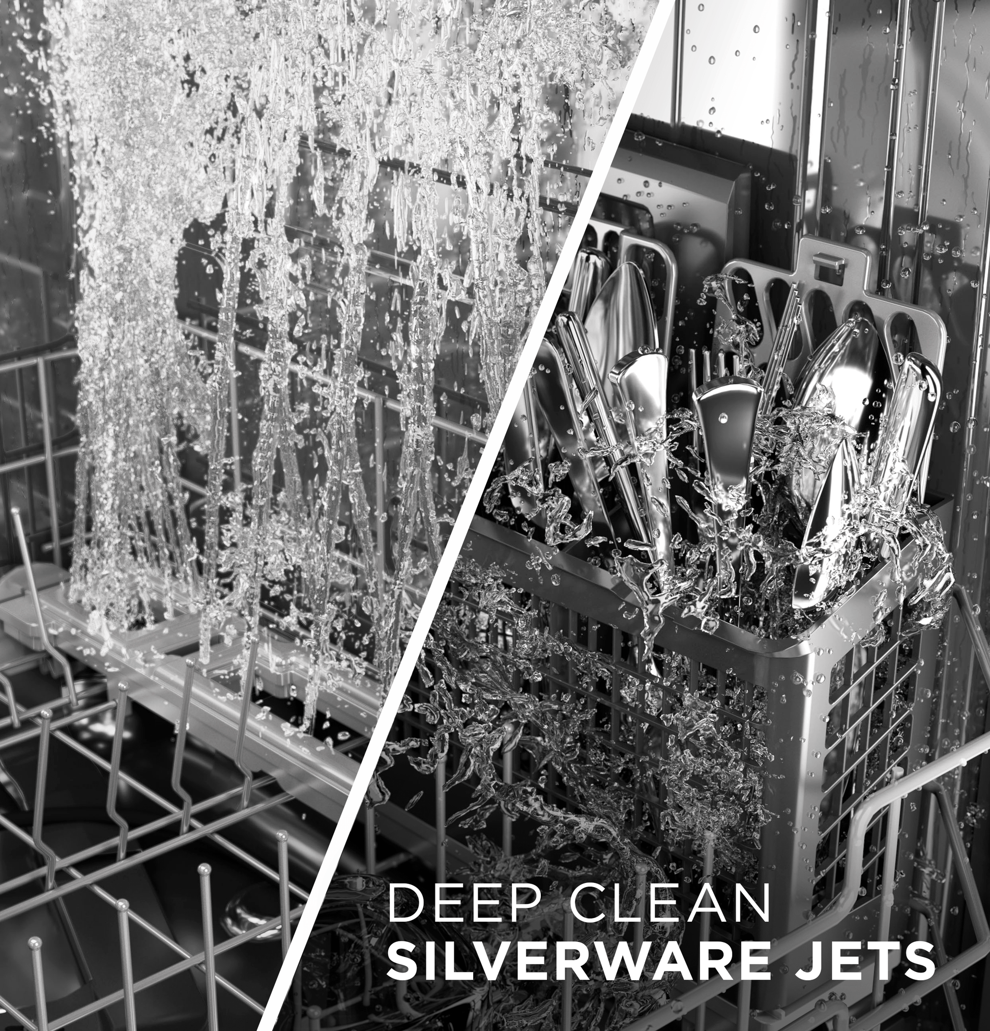 A system of 40 deep-cleaning silverware jets blasts the silverware basket from the bottom up, removing all stuck-on food for sparkling results.