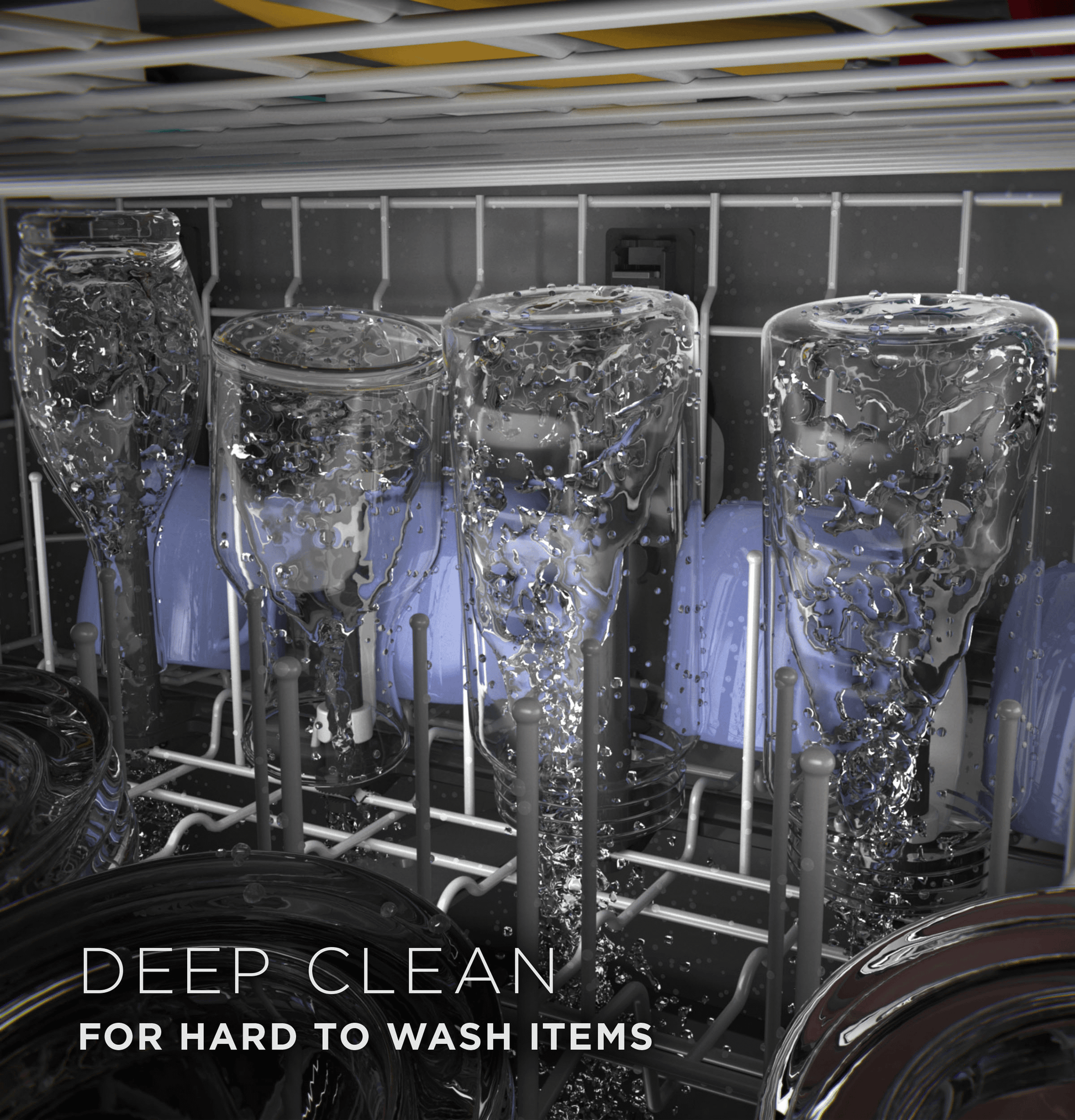 This dishwasher with bottle jets ensures a deep clean for tall items, narrow glasses, jars and more. In the upper rack, each of the four bottle jets directs water and detergent inside to effectively wash hard-to-reach areas