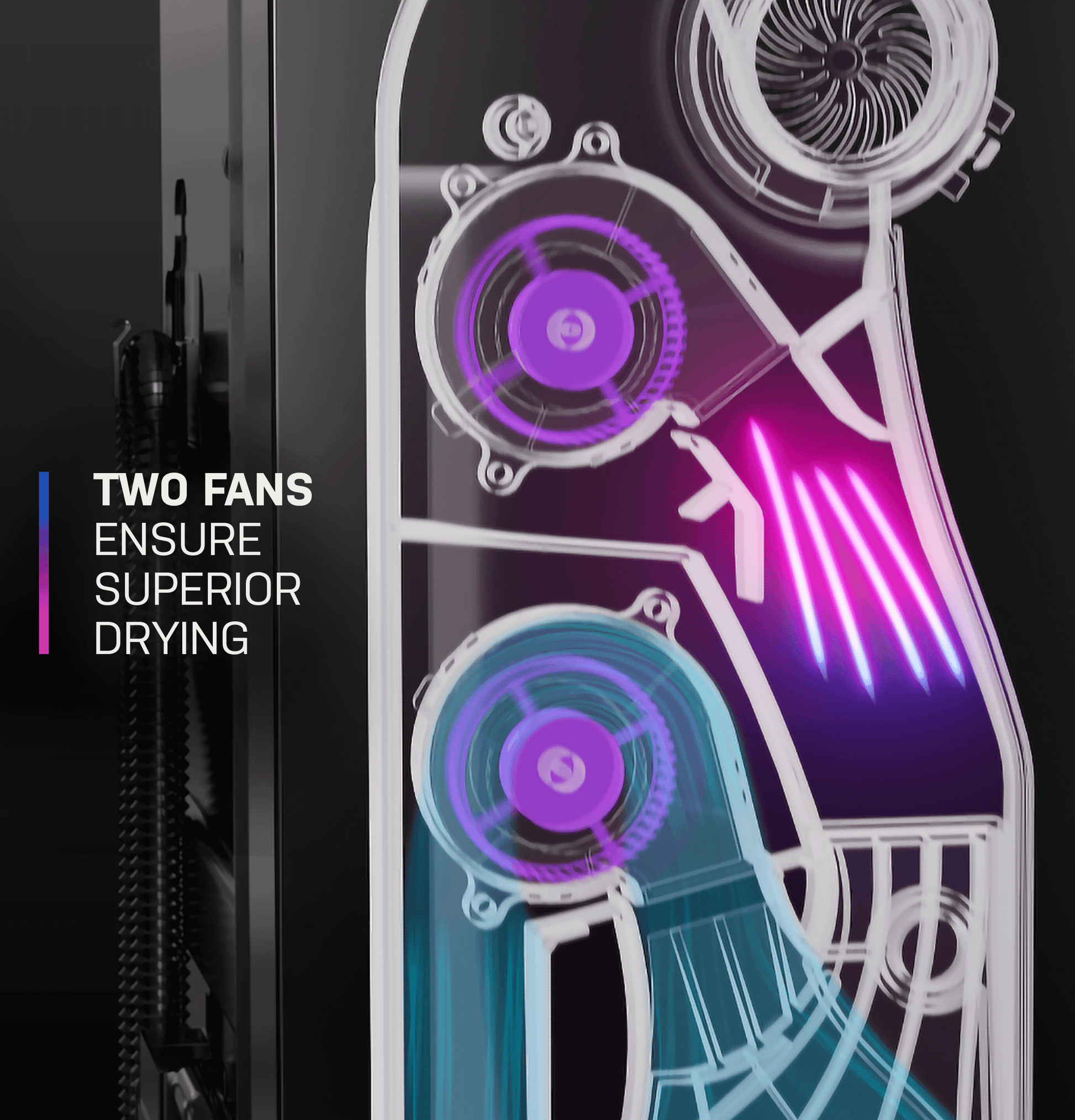 The Twin Turbo Dry Boost™ system uses a smart dual wattage heater and 2 fans that work together to remove water from hard-to-dry items like plastics and sports bottles.