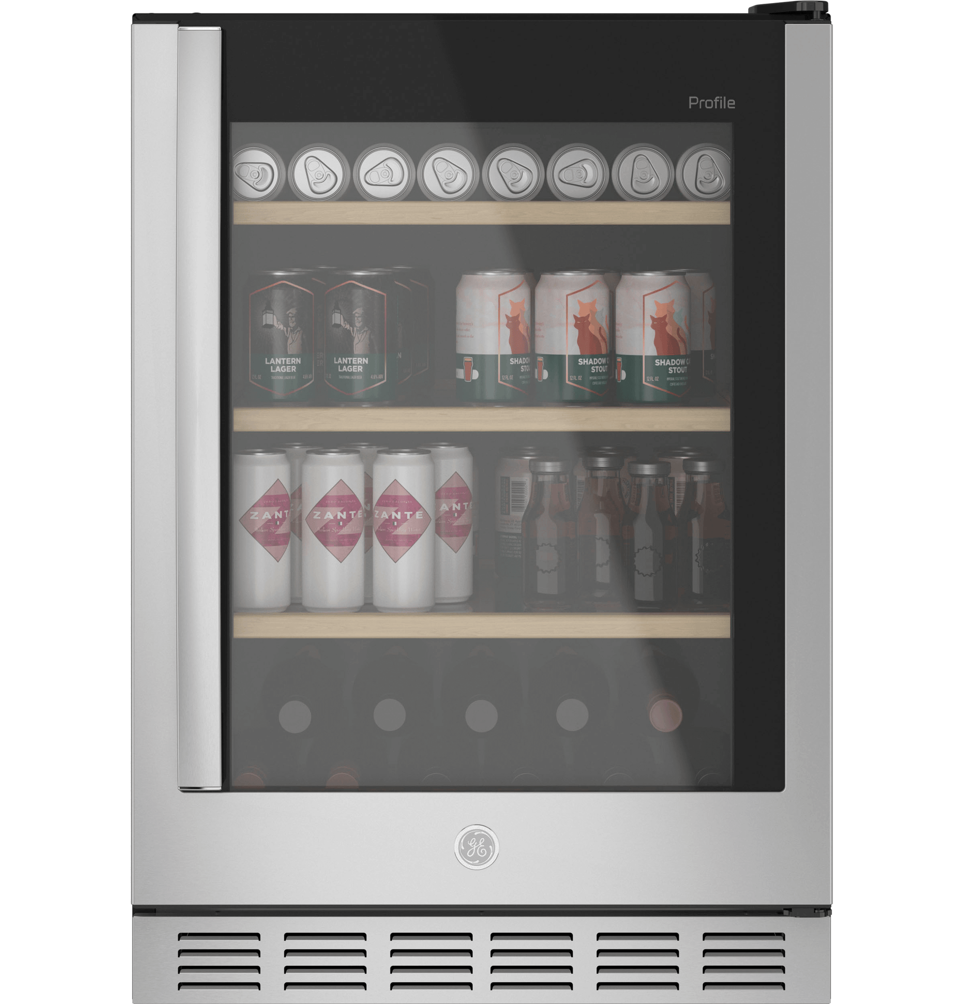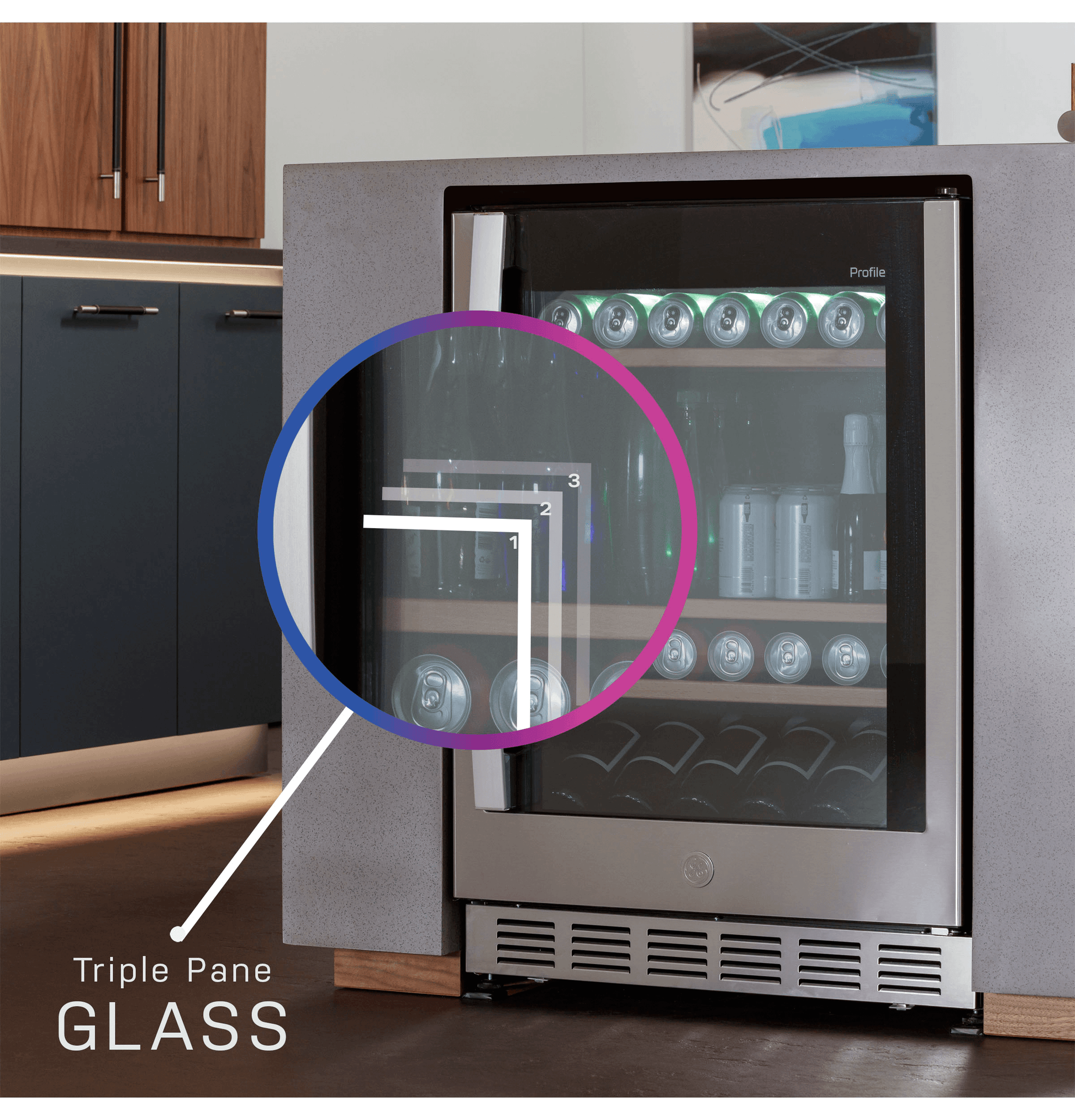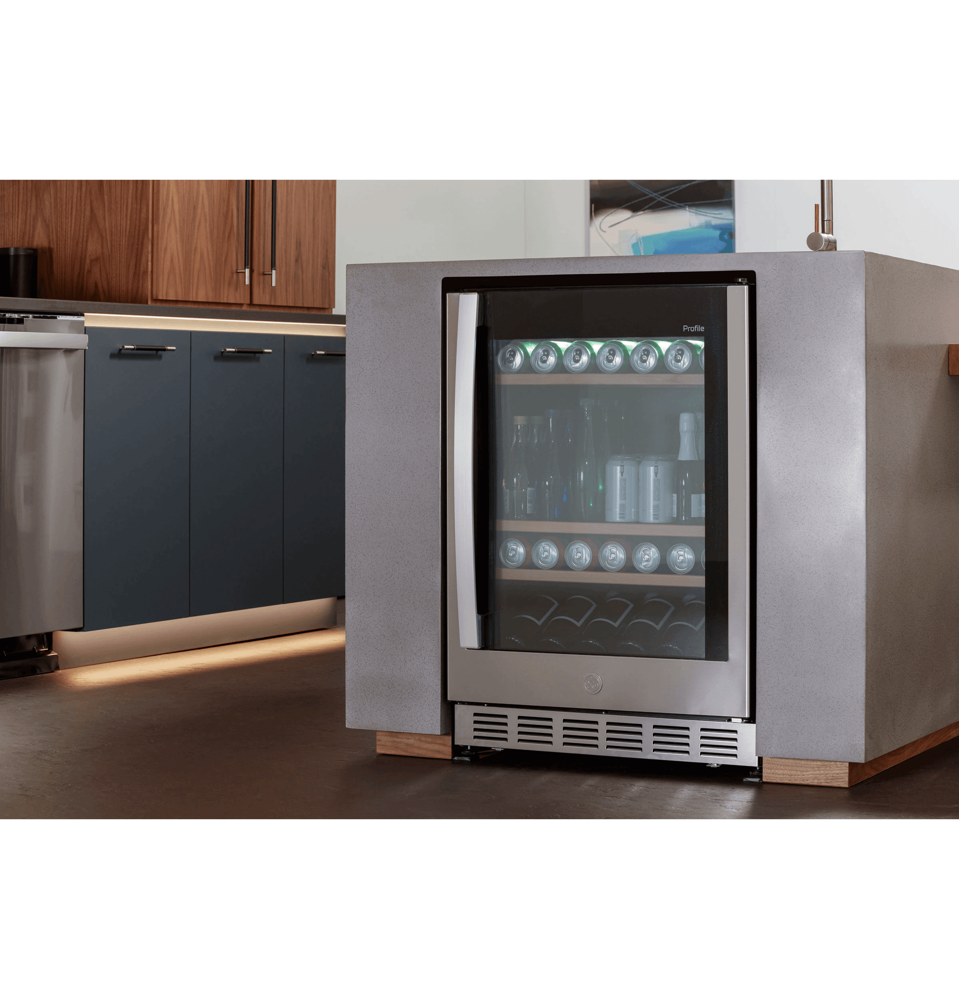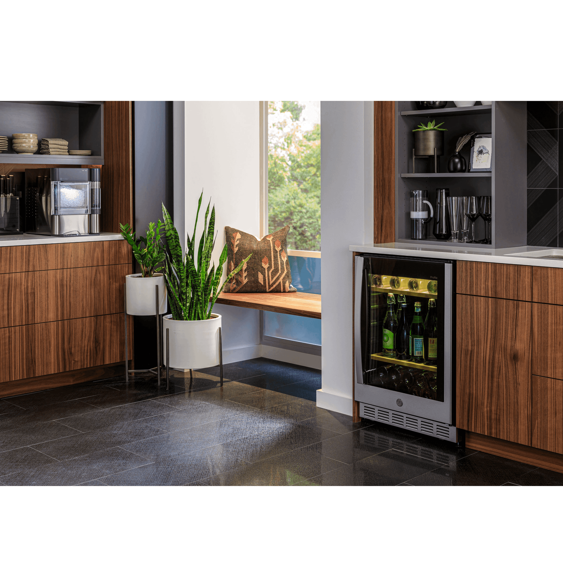 - The modern design on this beverage center features a sleek handle and glass door with stainless trim that will integrate into your kitchen beautifully