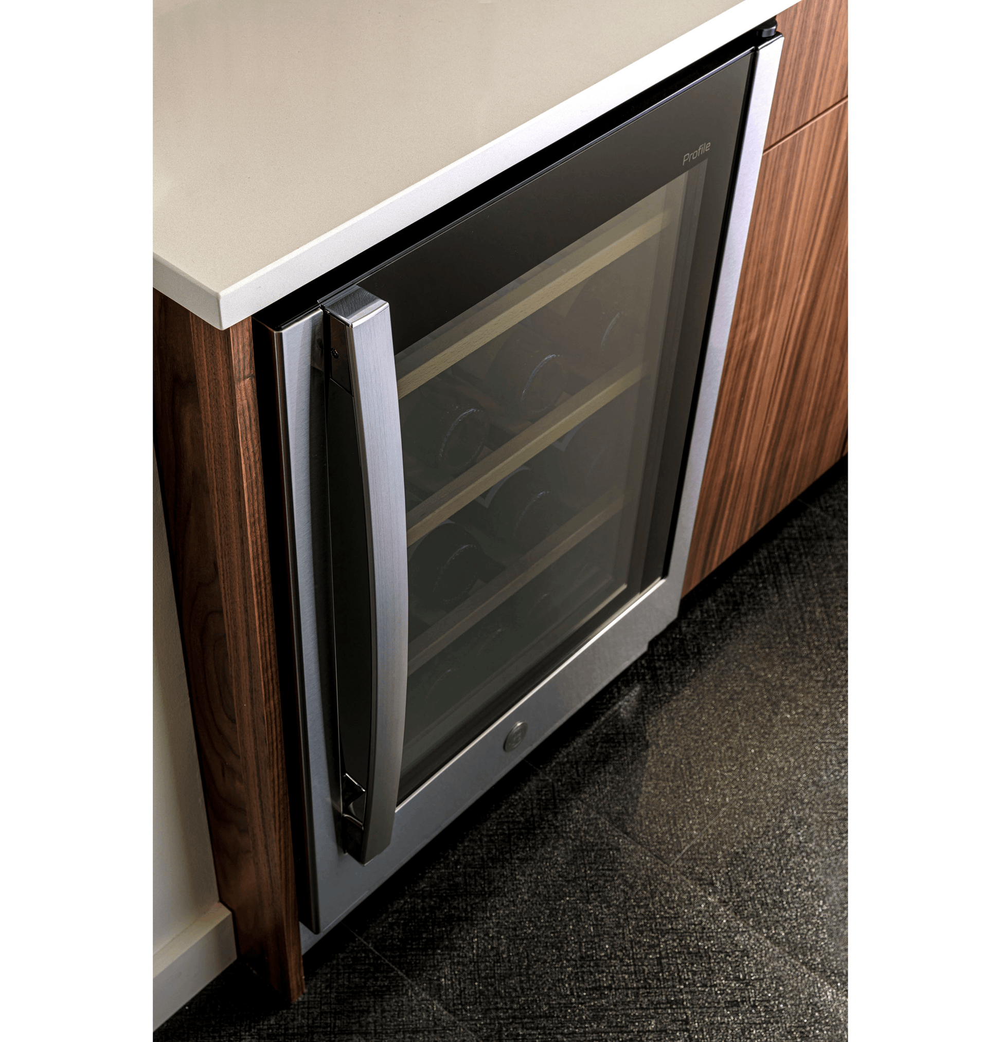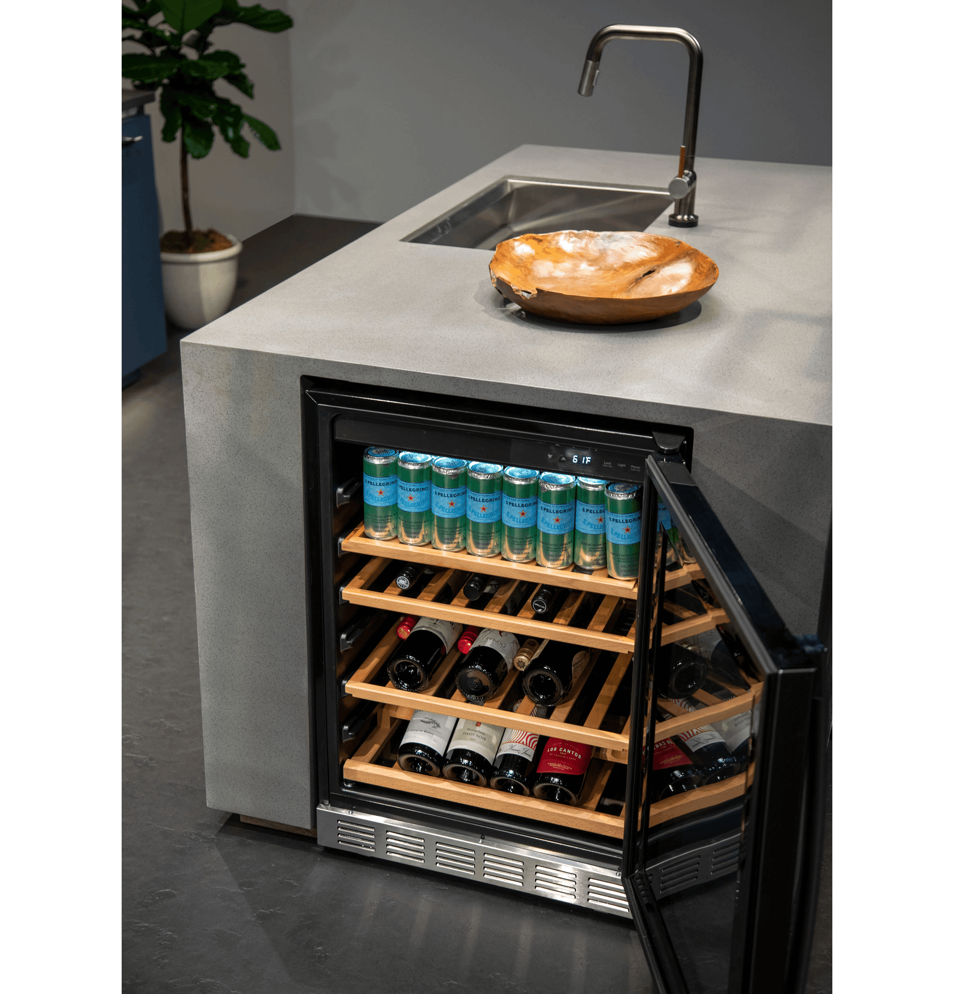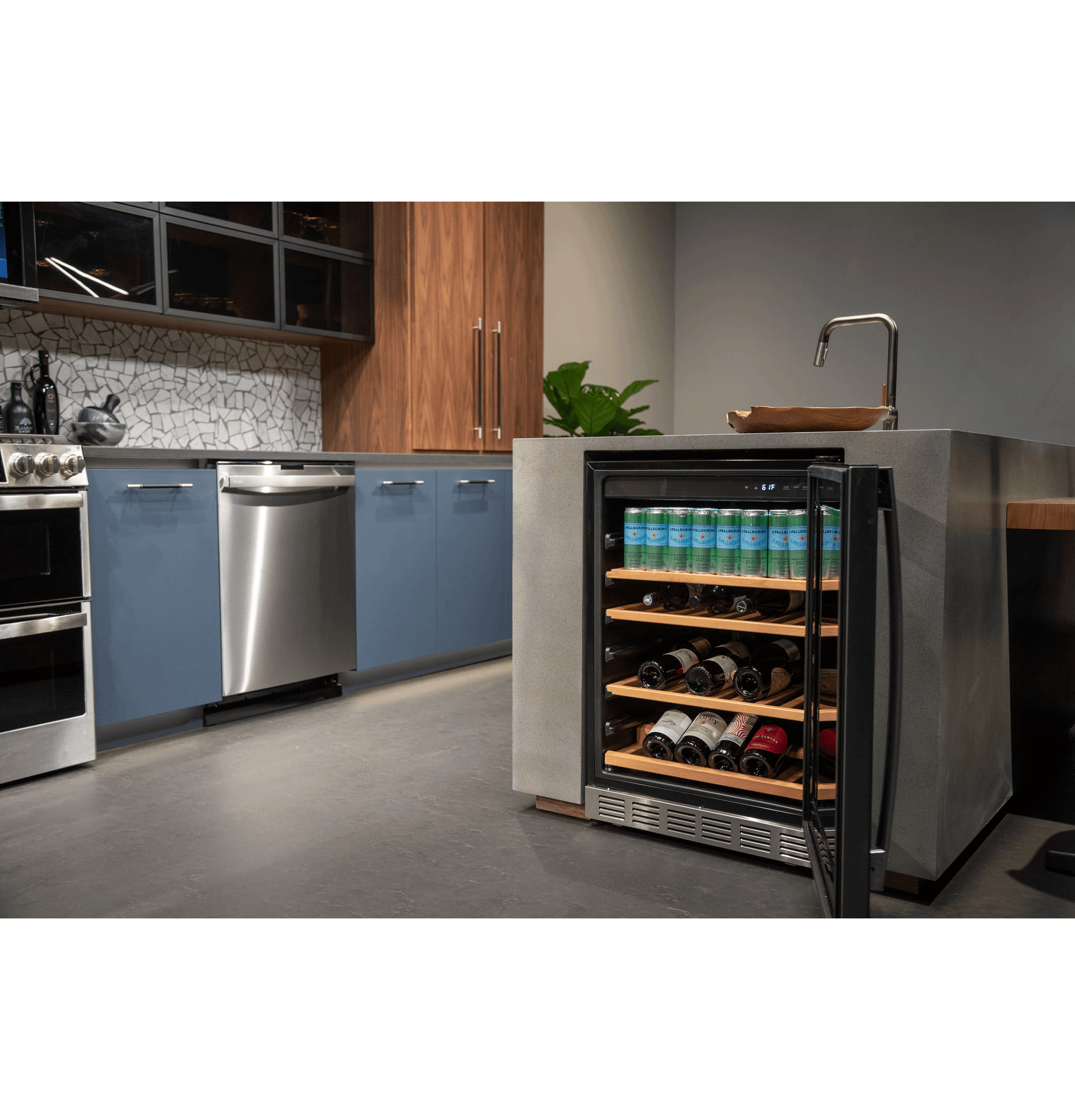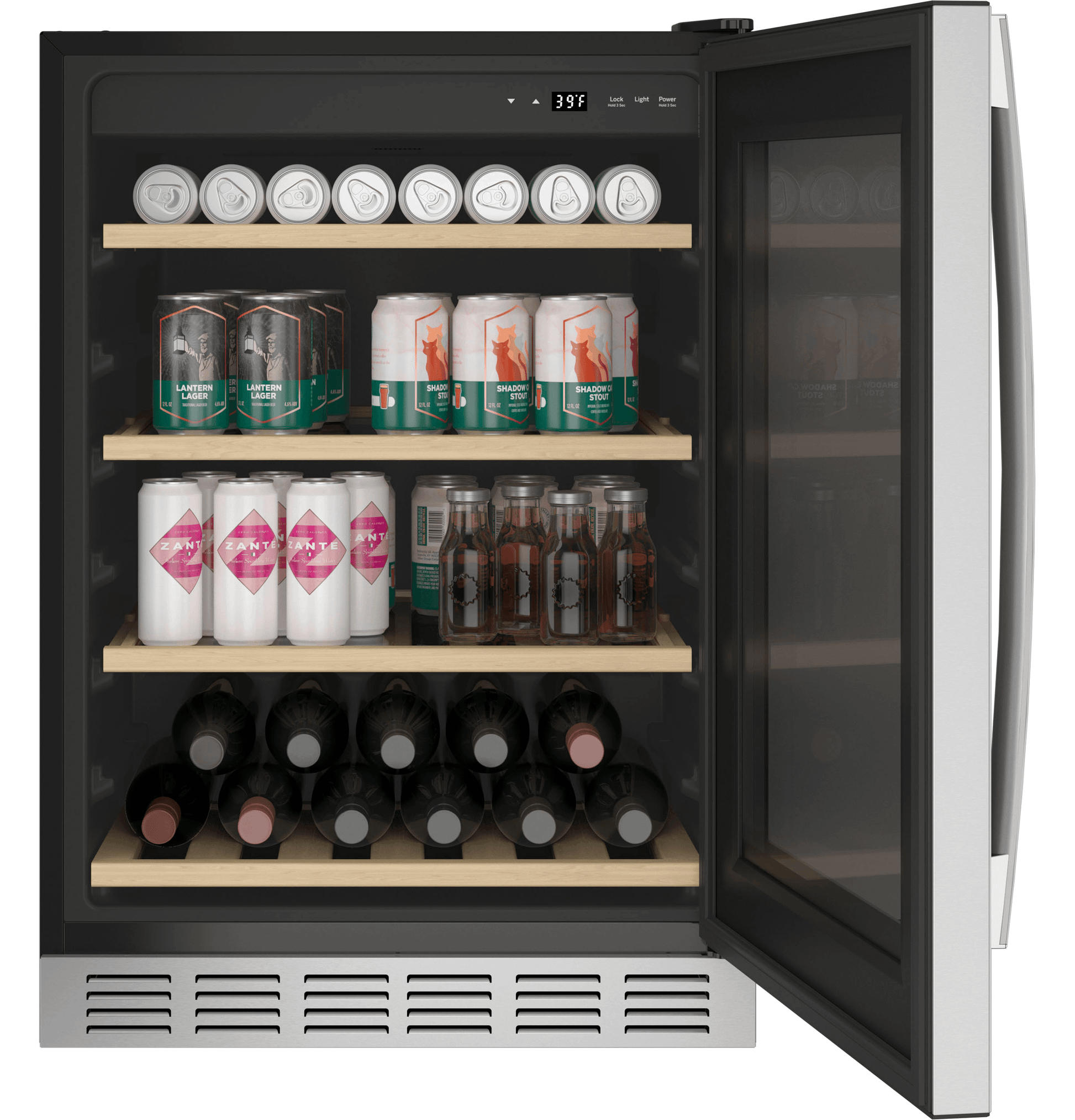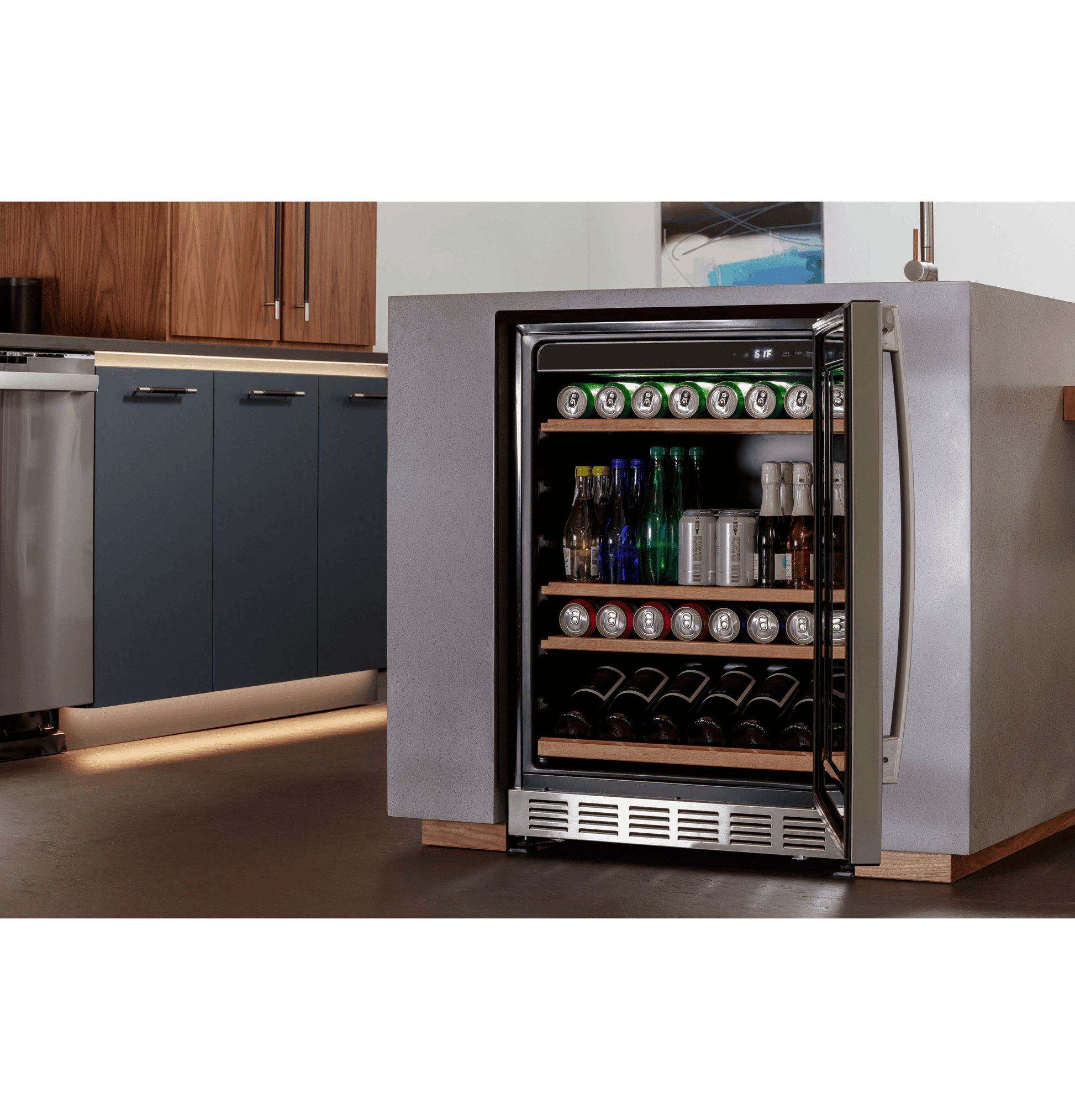 - The modern design on this beverage center features a sleek handle and glass door with stainless trim that will integrate into your kitchen beautifully