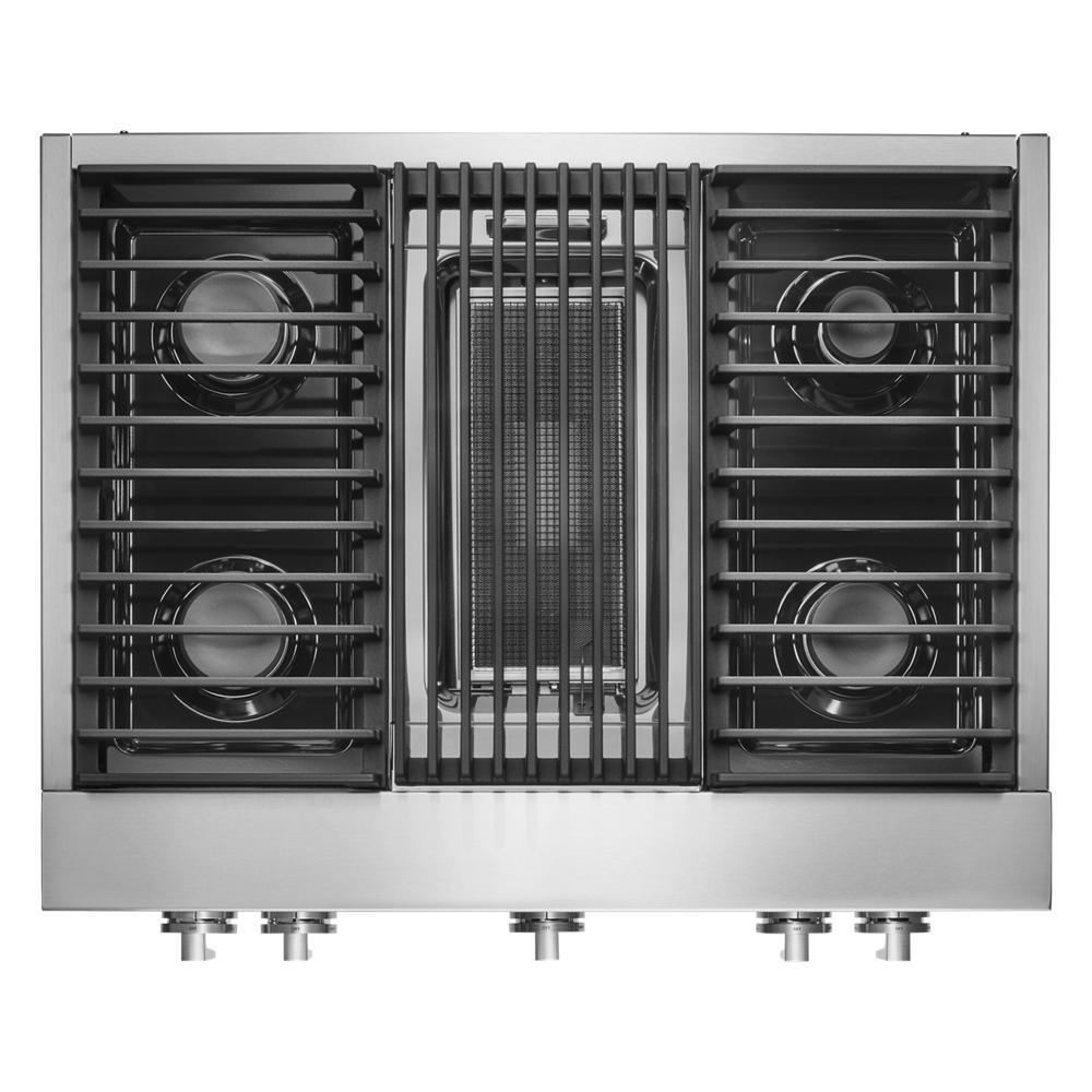 - Robust geometric grates form one graceful surface, crafted to withstand heavy woks and cookware.