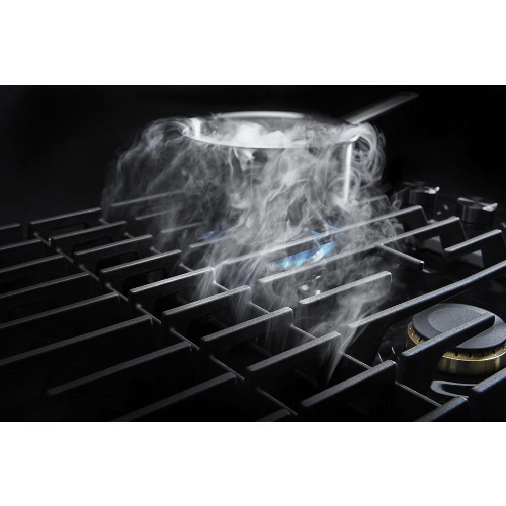 This JennAir® luxury gas downdraft cooktop features four sealed burners, including a 17,000 BTU ultra-high output burner. Its impressive JX3™ downdraft ventilation system quickly and efficiently clears the air without a hood.