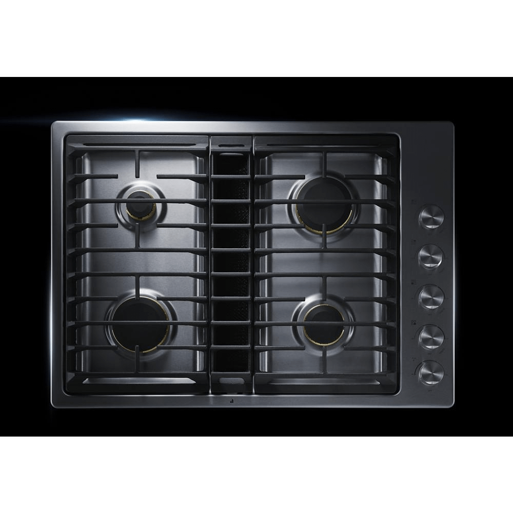 This JennAir® luxury gas downdraft cooktop features four sealed burners, including a 17,000 BTU ultra-high output burner. Its impressive JX3™ downdraft ventilation system quickly and efficiently clears the air without a hood.