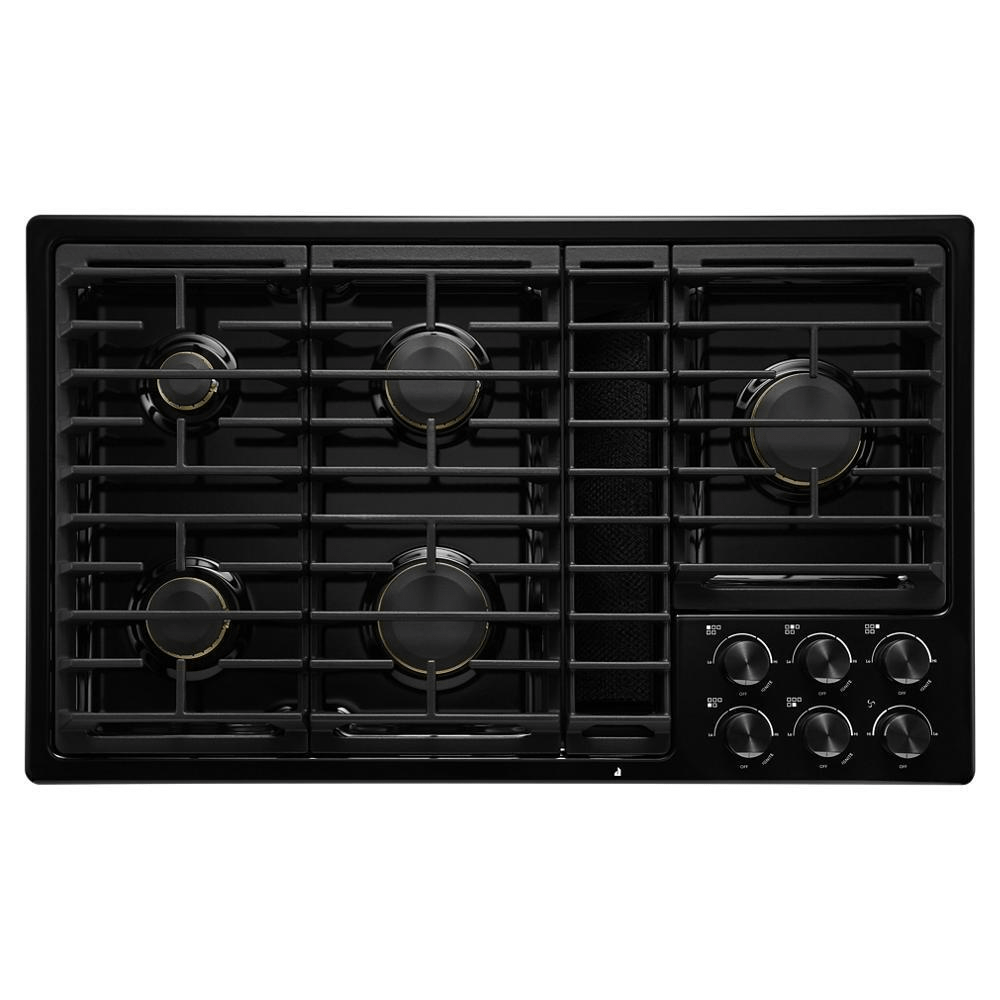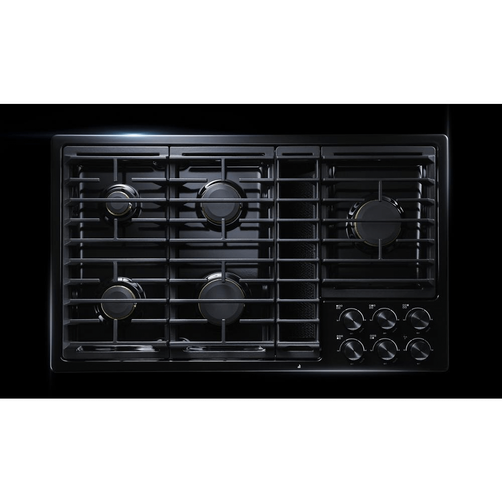 This JennAir® luxury gas downdraft cooktop features five sealed burners, including a 17,000 BTU ultra-high output burner. Its impressive JX3™ downdraft ventilation system quickly and efficiently clears the air without a hood.
