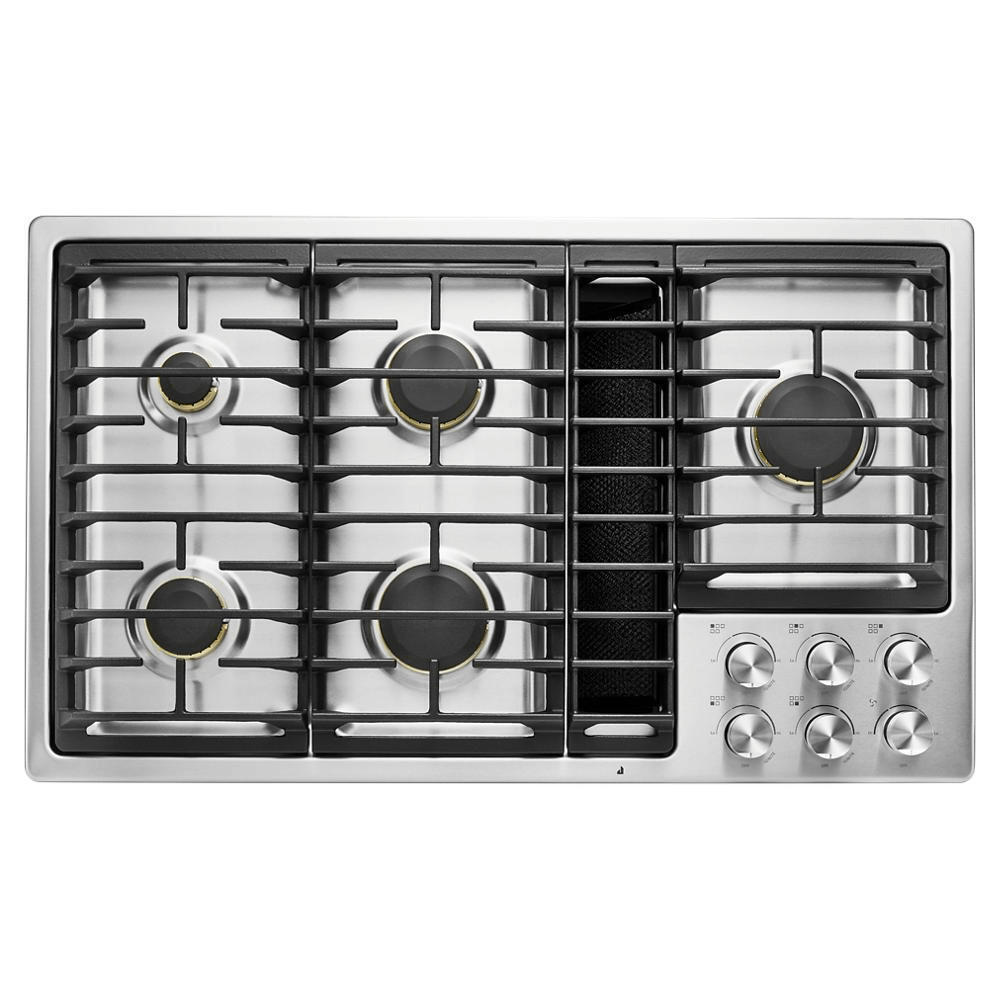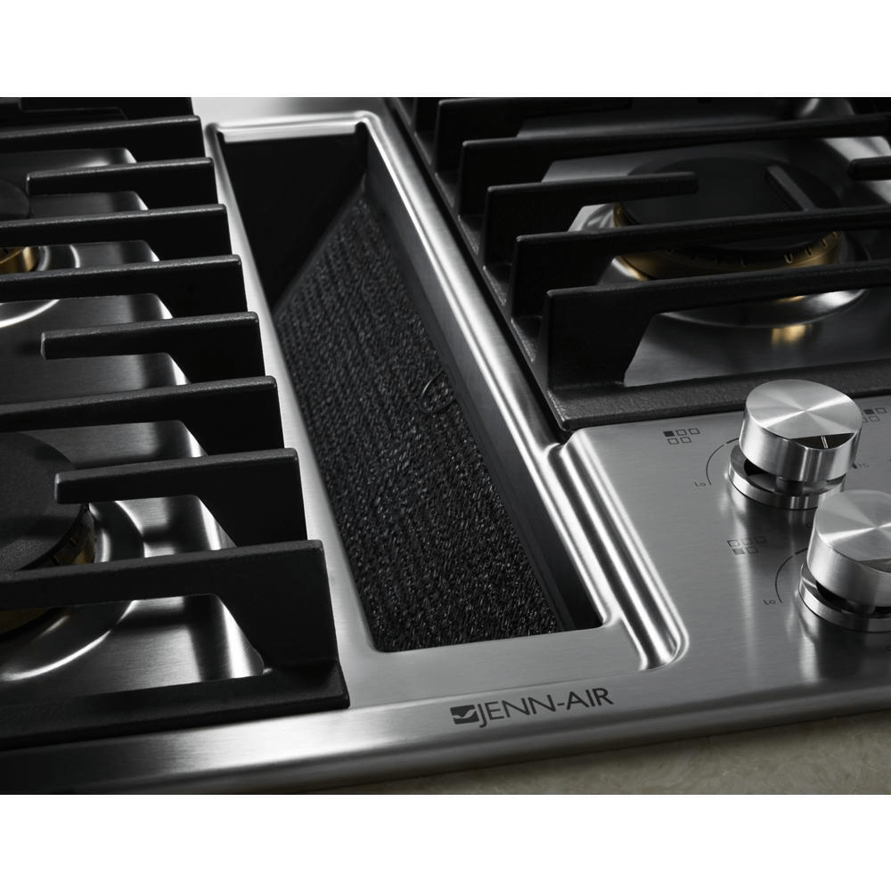 This JennAir® luxury gas downdraft cooktop features five sealed burners, including a 17,000 BTU ultra-high output burner. Its impressive JX3™ downdraft ventilation system quickly and efficiently clears the air without a hood.