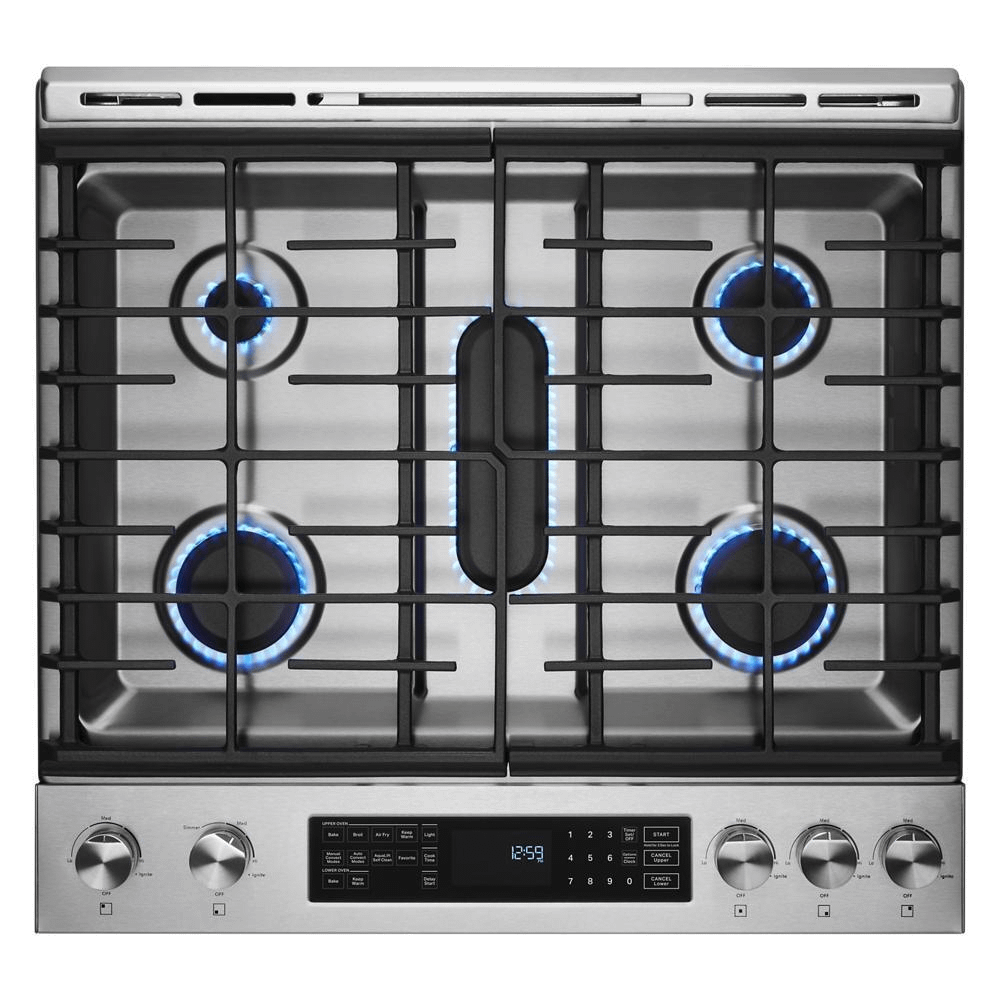 Revel in the power and flexibility of a JennAir® gas slide-in range. Stir-fry over a Dual-Stacked PowerBurner with an output of up to 19,000 BTUs, cook multiple dishes on multiple racks in the 5.8 cu. ft. oven cavity, then slow roast or proof bread in the separate Baking Drawer.