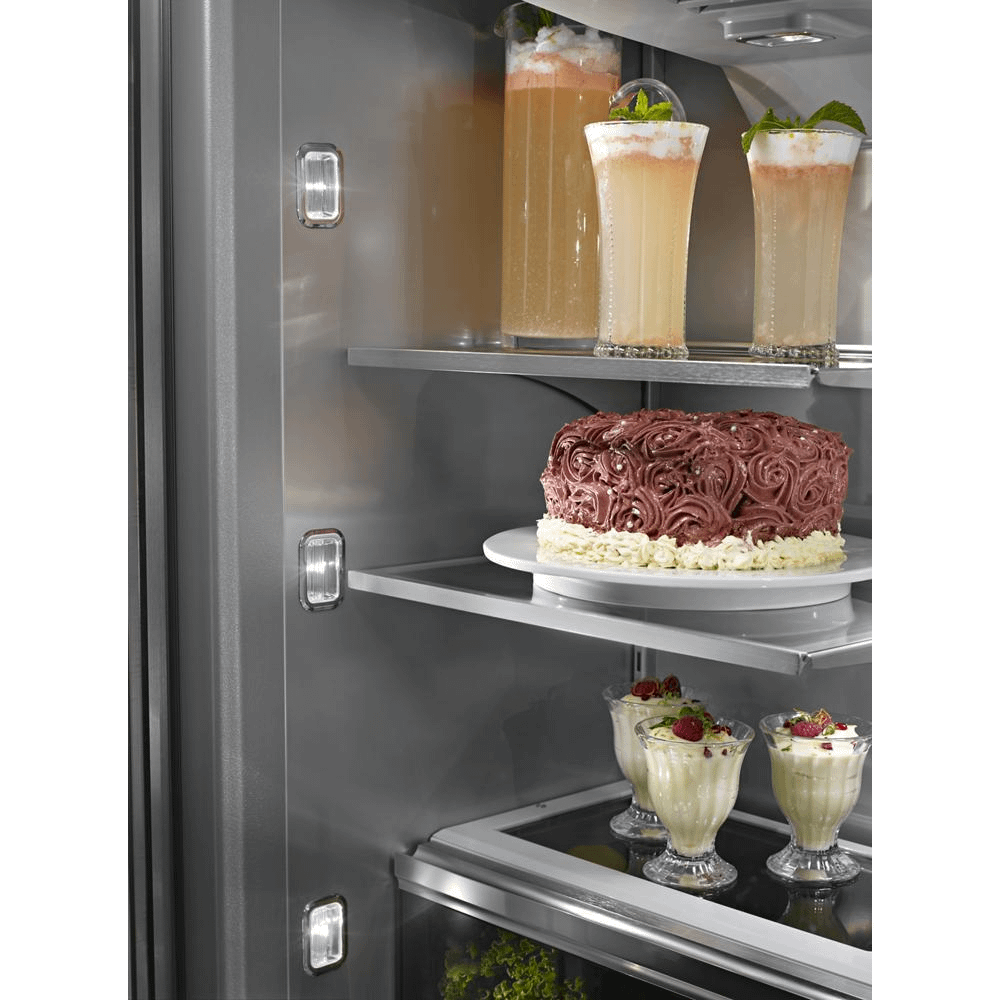 Behind these built-in French doors lie performance and beauty. The Preserva® Food Care System features three technologies that work in concert to assure crisp produce and deliciously flavorful foods while helping to eliminate refrigerator odors. The glossy silver Platinum Interior Design complements the metallic accents on shelves, crisper and baskets while the SatinGlide® System with Soft-Close assures their smooth operation.