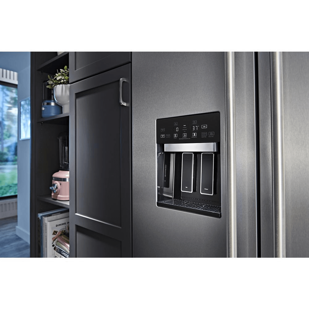 - fits glasses and measuring cups, and dispenses filtered water and ice without having to open the refrigerator door.