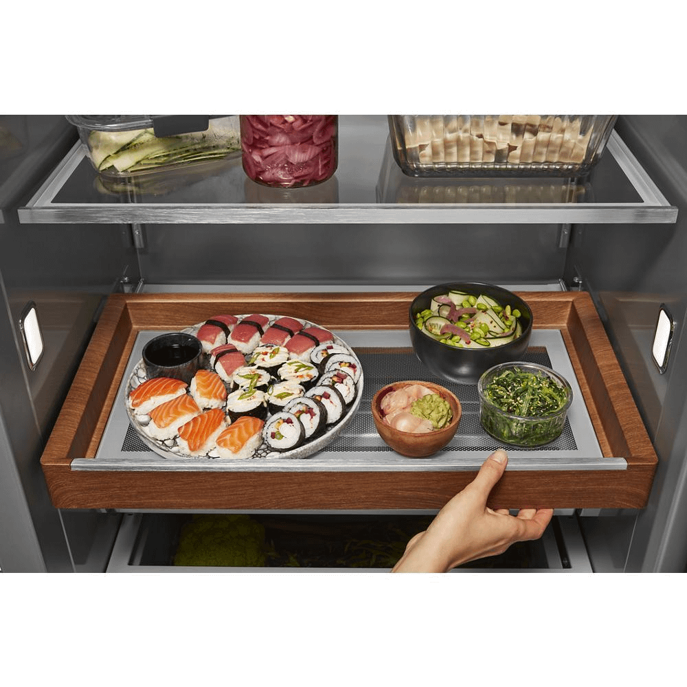 This premium 48 built-in refrigerator with exterior ice and water dispenser features PrintShield™ Finish to resist fingerprints outside, and has innovative storage inside. Like the Under-Shelf Prep Zone with included bakeware, and the moisture- and stain-resistant Wood-Look Pull Out Tray that keeps ingredients beautifully organized. Plus, optimal temperatures for ingredients are maintained with the ExtendFresh™ Plus Temperature Management System.