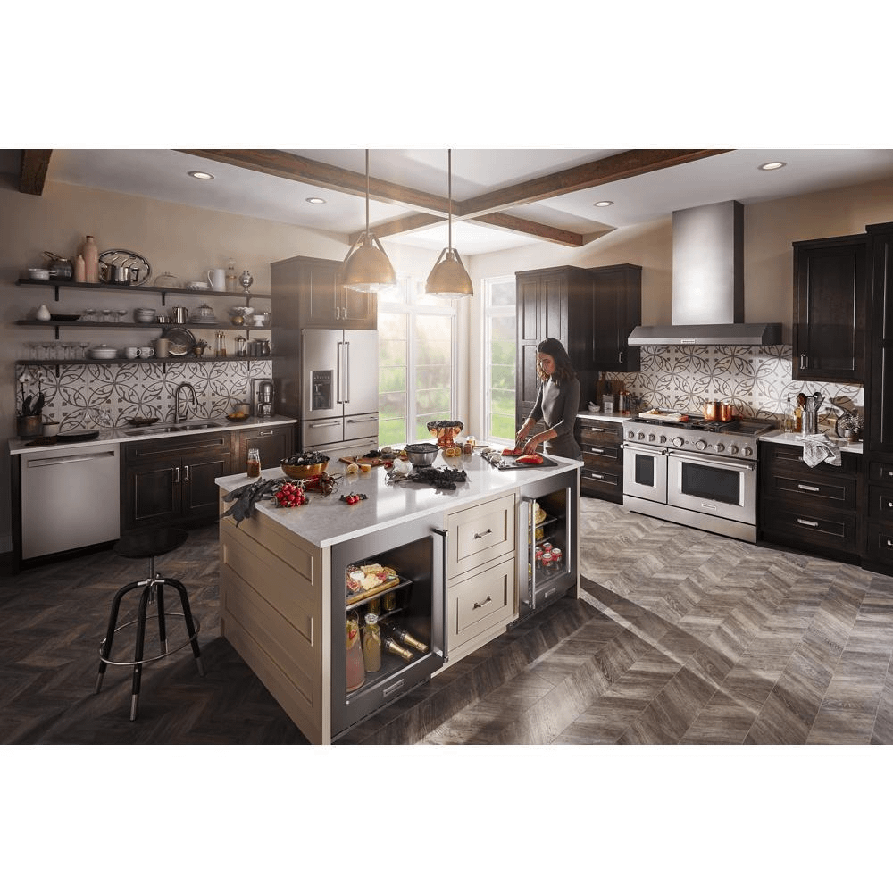 This Undercounter Refrigerator makes room for party essentials from platters to pitchers. Motion-Activated LED Lighting turns on inside as you approach, so you can see through the UV-Protected Thermal Glass Door to what s inside, and a Temperature Monitoring System with sensor alert adds peace of mind. Fully Flush Installation with Hidden Hinges provides a built-in look within cabinetry.