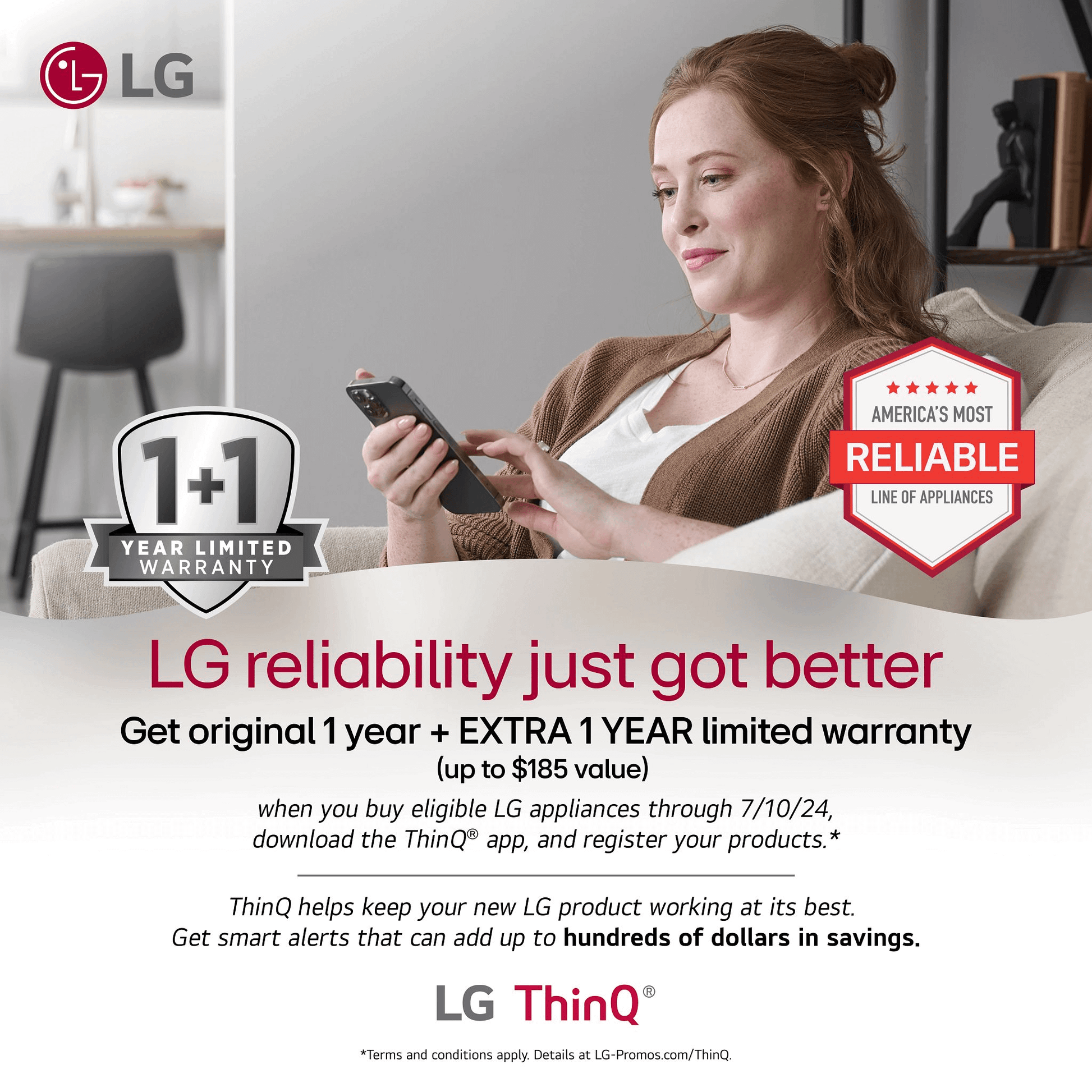 Purchase a qualifying LG product and register it through ThinQ app to receive a free 1 Year Extension on Manufacturer Warranty, valued up to $185