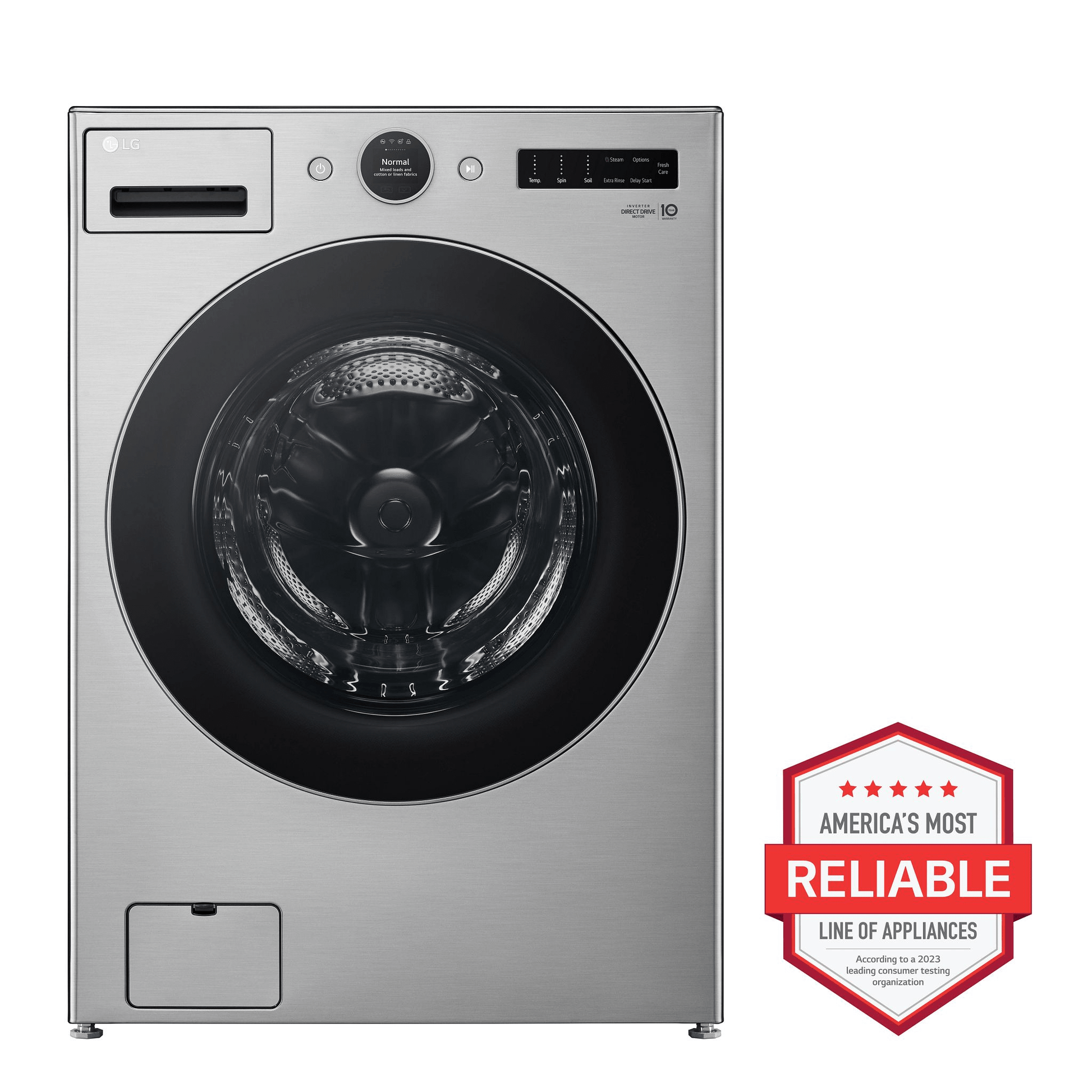 - The modern flat front design, graphite steel finish and tinted, tempered glass doors bring a premium point of view to your laundry space.
