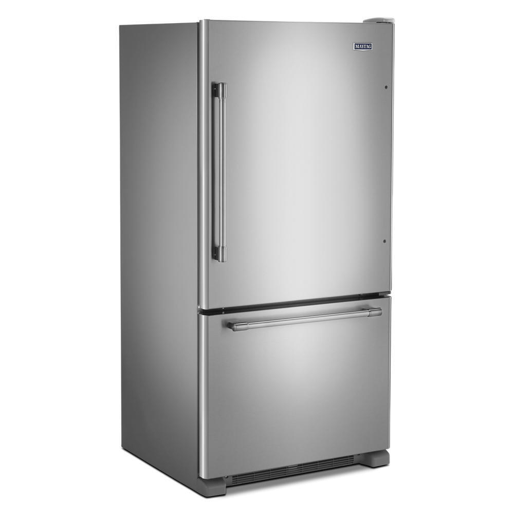 Tough enough for any kitchen, a Maytag® 33-inch bottom freezer refrigerator is built for the long haul and backed by a 10-year limited parts warranty on the compressor. Fingerprint Resistant Stainless Steel keeps this refrigerator looking as good on the outside as it cools on the inside. BrightSeries™ LED lighting and frameless glass shelves add a premium look and feel. Humidity controlled FreshLock™ crispers and a factory-installed ice maker help keep foods fresh and drinks ice cold. This 33" refrigerator is designed, engineered and assembled in the U.S.A. with genuine American Pride.