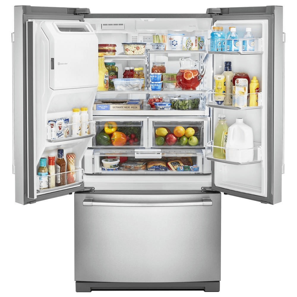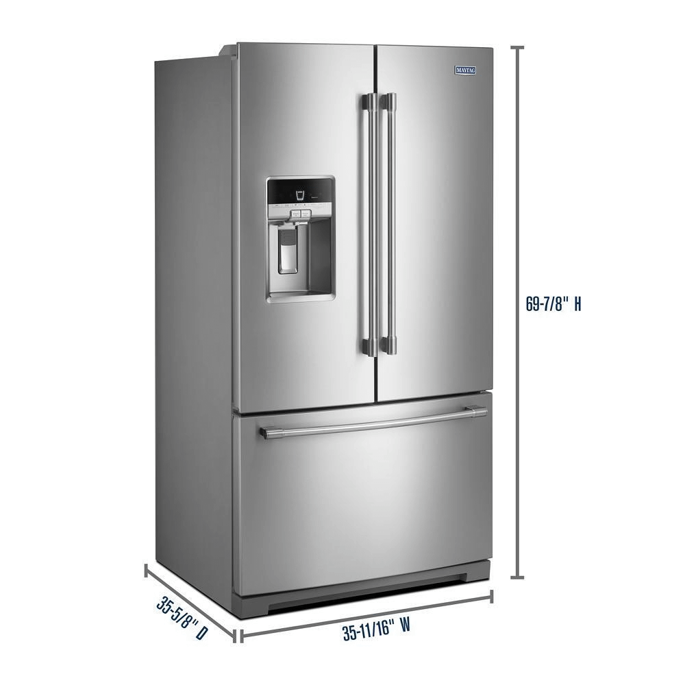 Maytag® stainless steel french door refrigerators are built tough with strength and storage you can depend on. The PowerCold® feature gives you temperature control with the push of a button and the FreshLock™ crispers use humidity control to keep your produce full of flavor. The metal slide-out shelf gives you fast access to foods and LED lighting helps you see what you're working with. Free up shelf space in this 36-inch refrigerator with the removable Store-N-Door® ice dispensing system, which is perfect for filling large containers like blenders and coolers. Also, our 10-year limited parts warranty* on the compressor covers the heart of the fridge, so you know you can count on it to keep all your food cold for years.