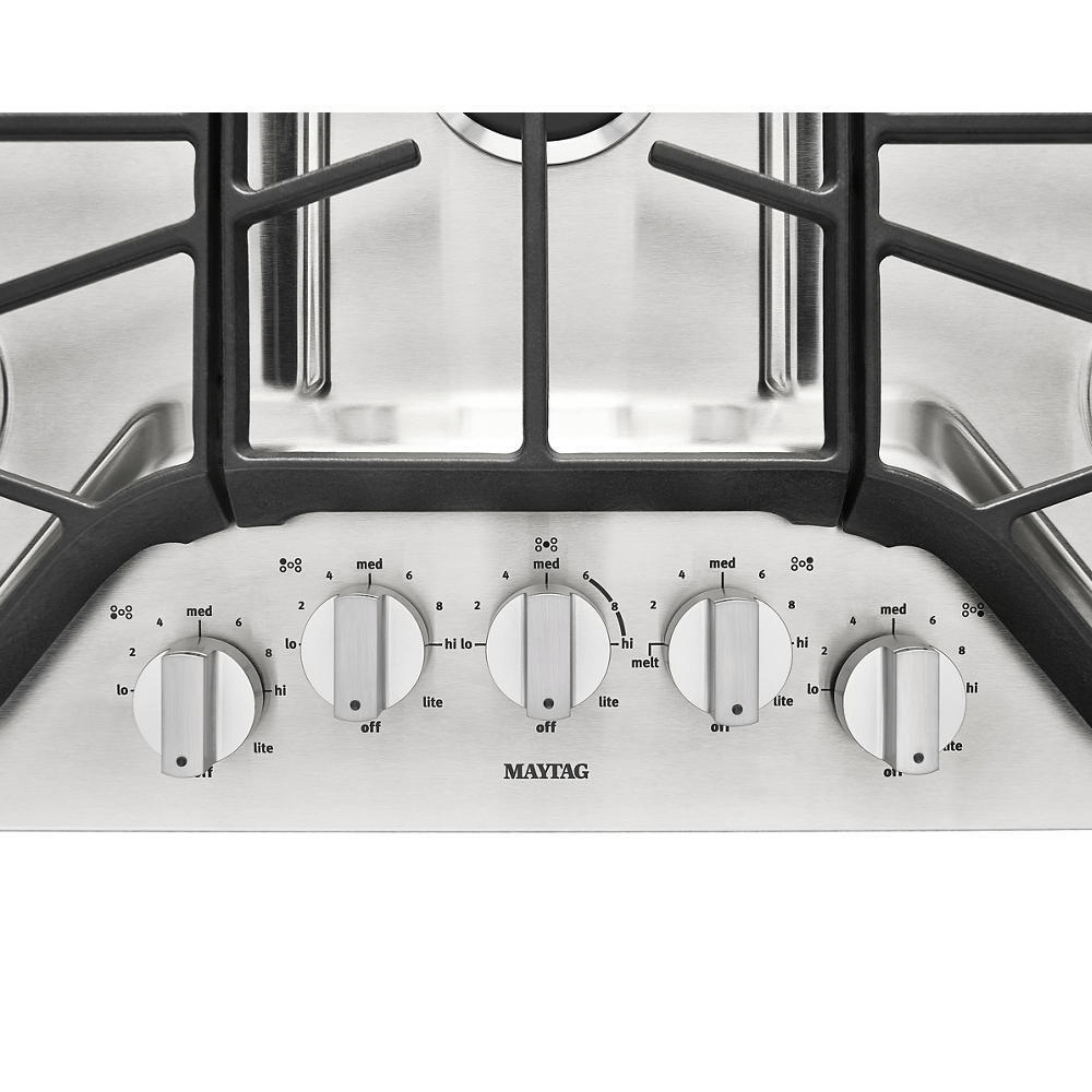 Take charge of your cooking experience with Maytag® gas cooktops. The 15,000-BTU Power™ Burner delivers heat on demand to sear flavor and juices into main dishes, while the simmer burner on this 36-inch gas cooktop allows for delicate control of savory sauces and soups. And this 5-burner cooktop will clean with ease thanks to features like the dishwasher-safe knobs and heavy-duty DuraClean™ cast-iron cooktop grates.