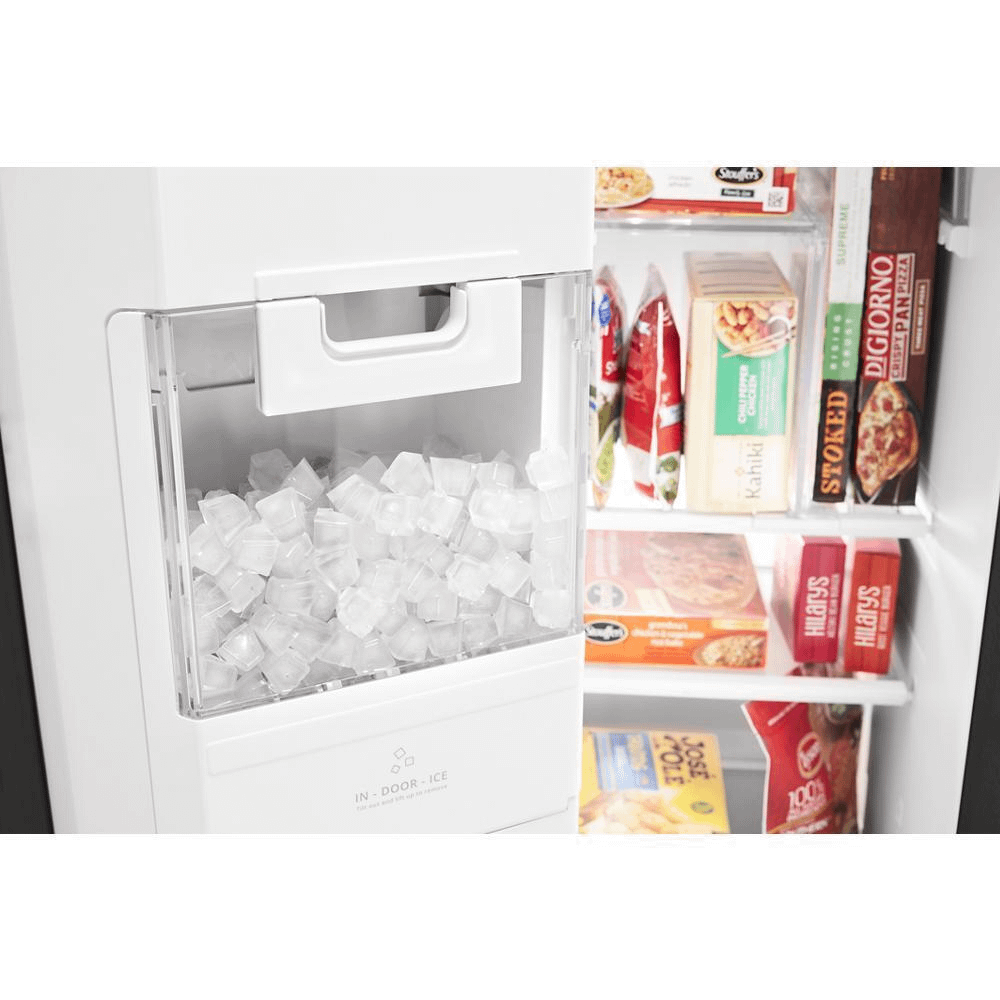 - The Store-N-Door(R) ice dispensing system frees up shelf space in the freezer, creating more room for tall items on the shelf. Plus, the bin is removable, so it's perfect to use for filling large containers like blenders and coolers.
