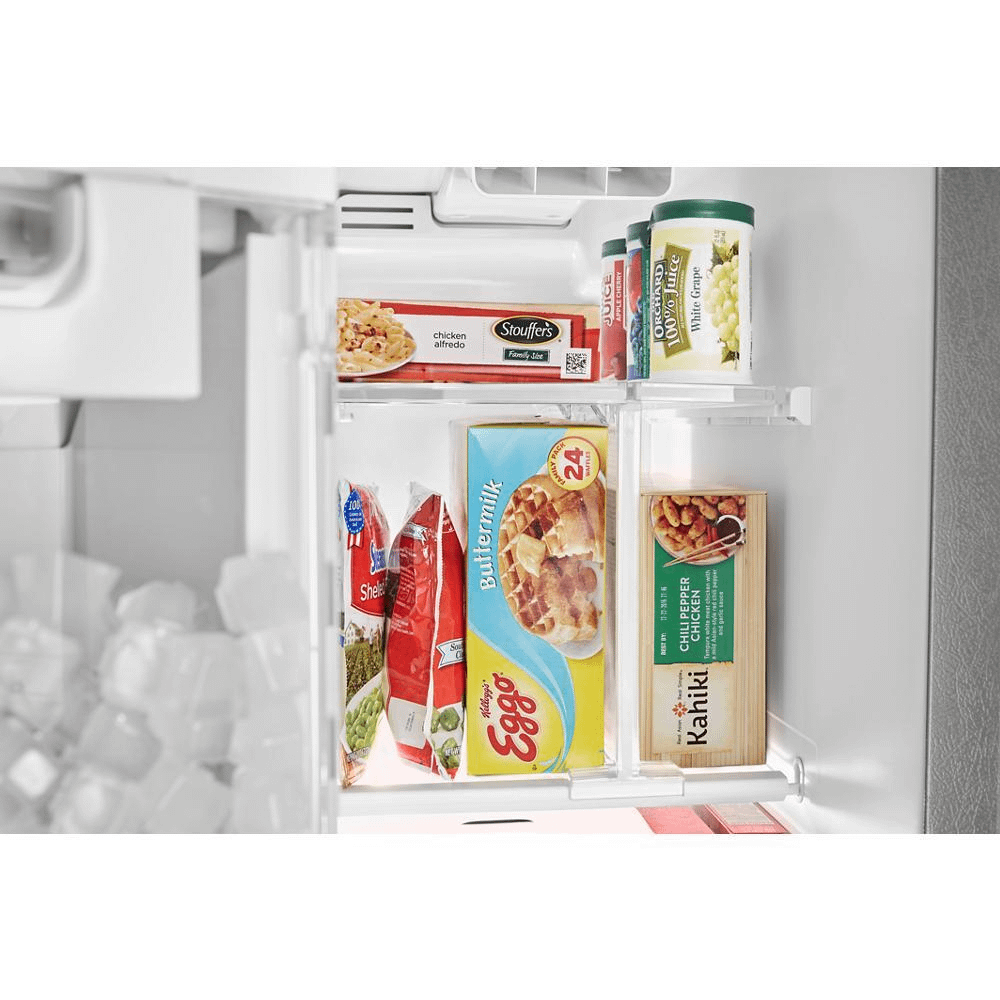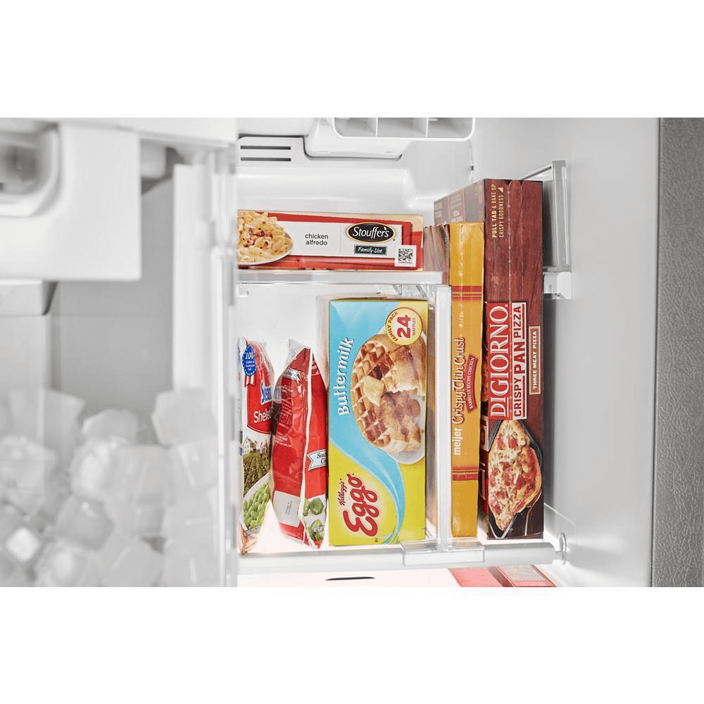 This side-by-side refrigerator is built tough and easy-to-clean with its fingerprint resistant stainless steel finish. Built with plenty of storage options, including a specially designed soft freeze bin that puts you in control of the way foods freeze. Put in a pint of ice cream and it's soft enough to scoop. Frozen pizza storage stores two frozen pizza boxes upright and out of the way, so quick meals are an easy grab. The distinct and durable Signature Maytag® metal shelf adds a bold look to the inside. With an exterior ice and water dispenser for easy access, plus a 10-year limited parts warranty on the compressor, this side-by-side fridge will keep it all cool for years and years.