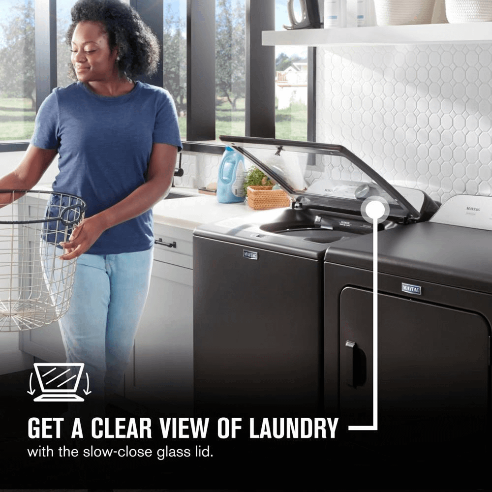 - Keep track of the action inside your washer with the slow-close glass lid. It offers a clear view of laundry and closes softly without slamming.