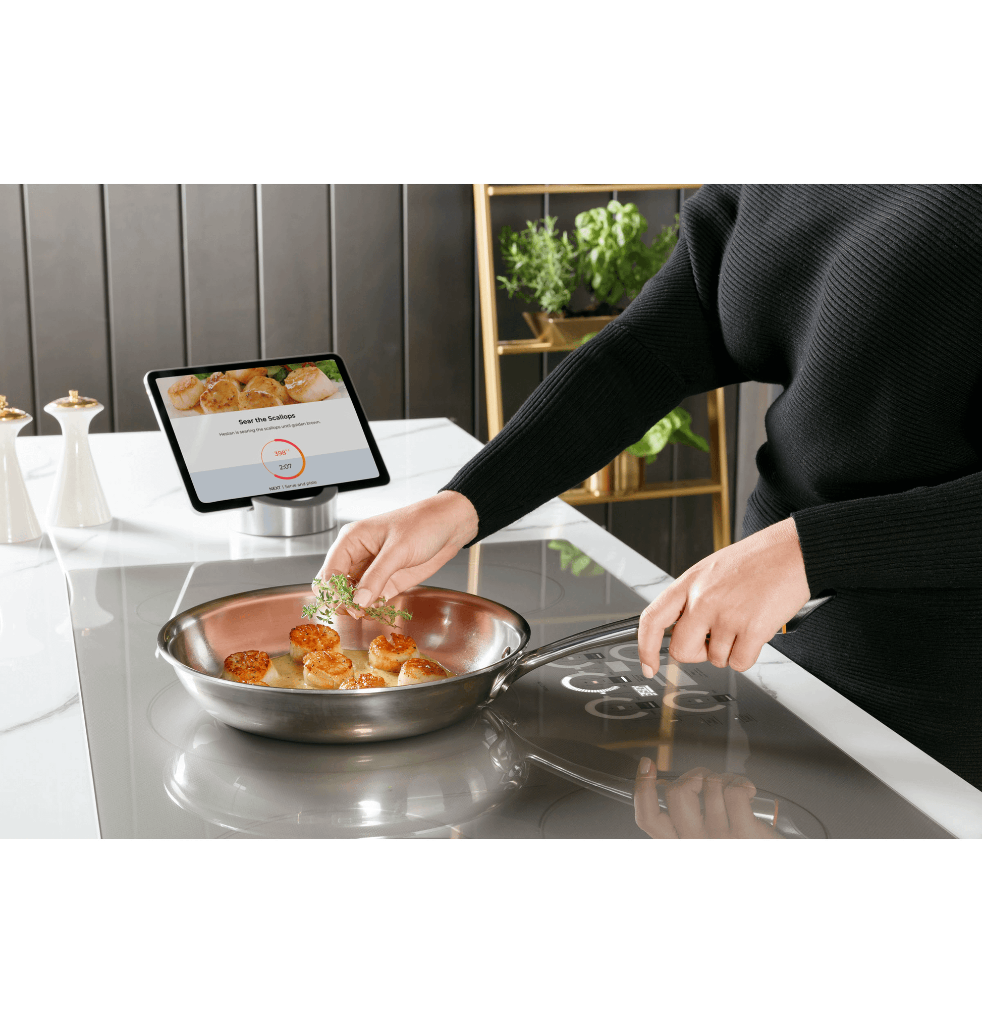 Follow along a video-guided recipe and your burners will automatically adjust time and temperature using a smart pan. Experience the joy of a perfectly cooked meal, from scallops to scrambles. Pan sold separately.