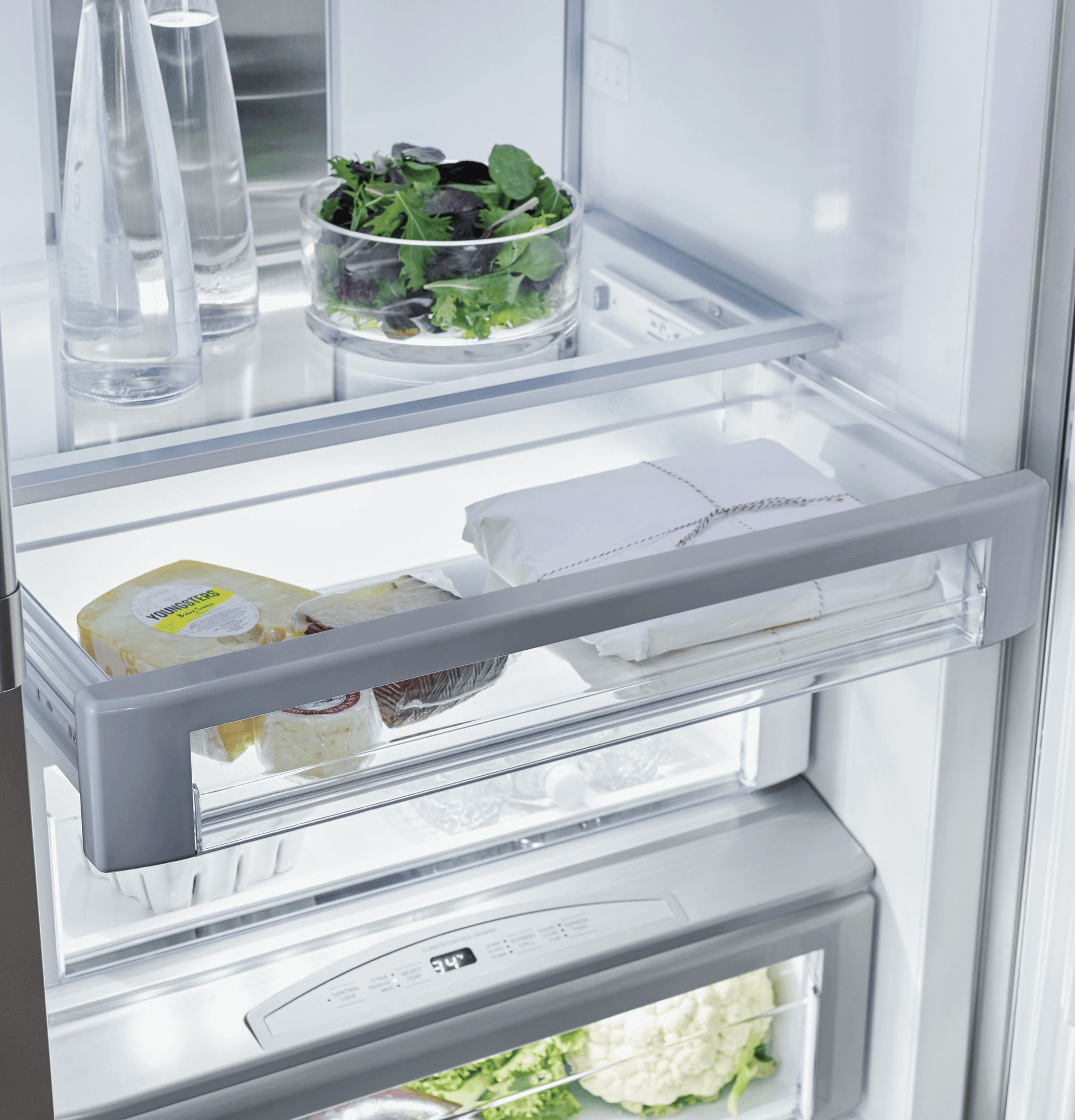 Light columns in the freezer and fresh food compartments extend the full length of the interior and LED lighting located inside the vegetable and climate-control drawers illuminate contents without compromising space