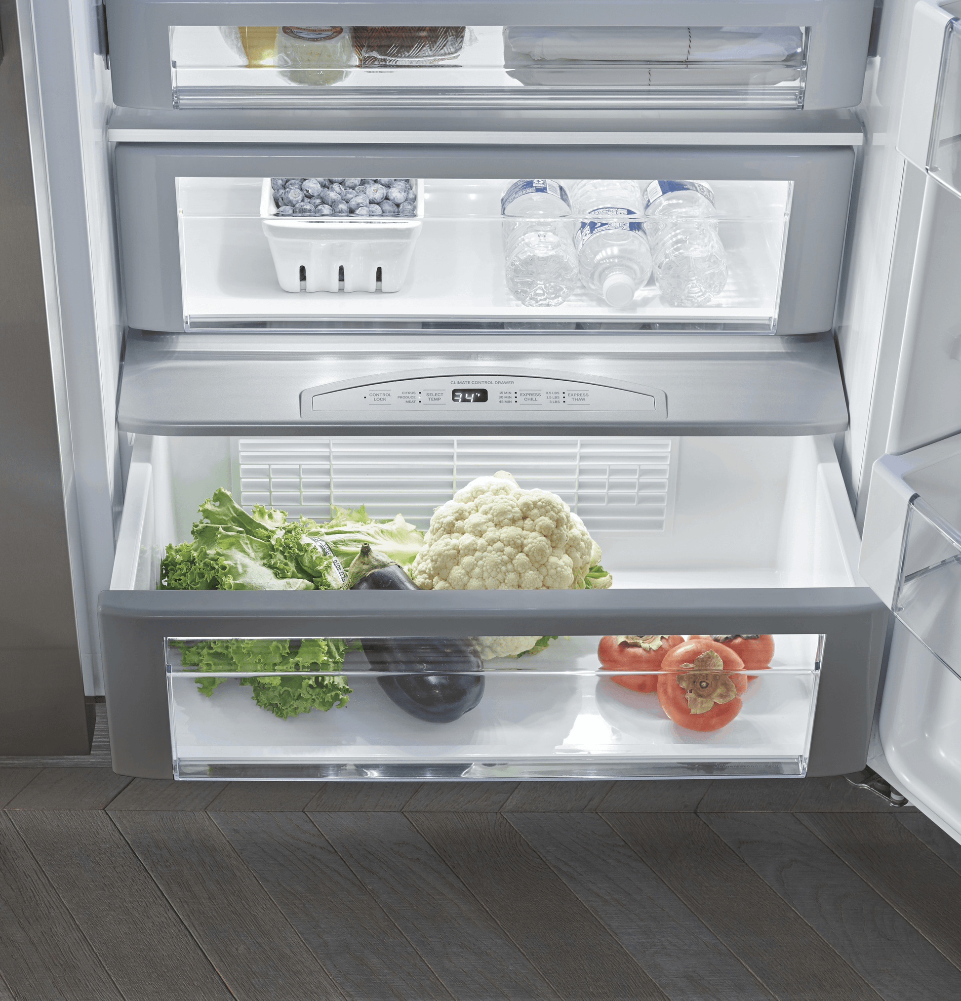 Light columns in the freezer and fresh food compartments extend the full length of the interior and LED lighting located inside the vegetable and climate-control drawers illuminate contents without compromising space