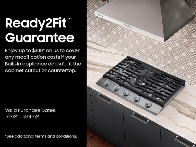 Receive up to a $300 rebate toward a cabinet cutout or countertop modification if your new qualifying Samsung 30inch or 36inch Built-In Cooktop or Wall Oven does not fit your current Cooktop or Wall Oven cutout.