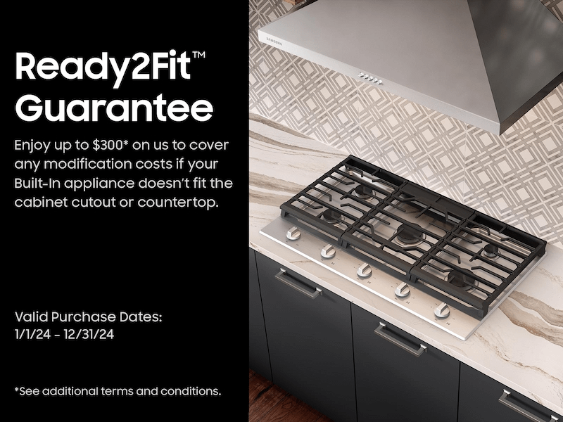 Receive up to a $300 rebate toward a cabinet cutout or countertop modification if your new qualifying Samsung 30inch or 36inch Built-In Cooktop or Wall Oven does not fit your current Cooktop or Wall Oven cutout.