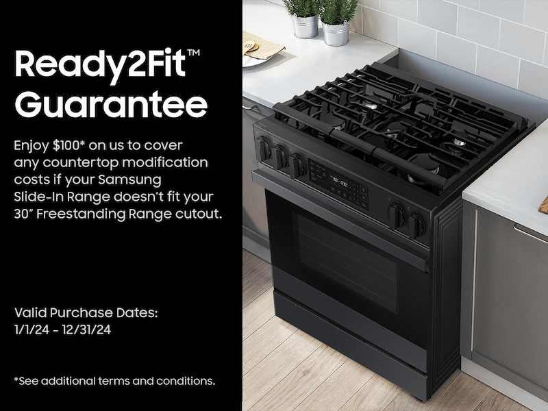 Receive up to a $100 rebate toward a countertop modification if your new qualifying Samsung 30inch Slide-In Range does not fit your current freestanding range cutout.